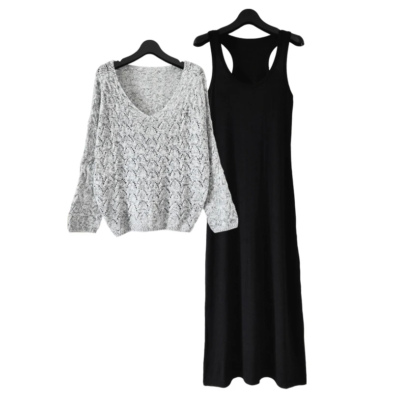 Parollada 2017 Новинка весны и летние тонкие Длинные рукава вязать Свободные из двух частей платье черный платье на бретелях Топ