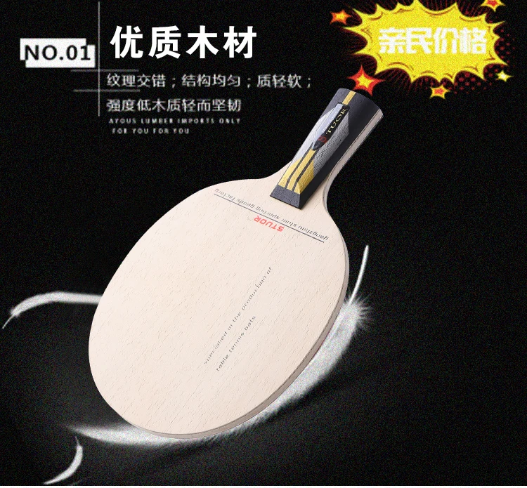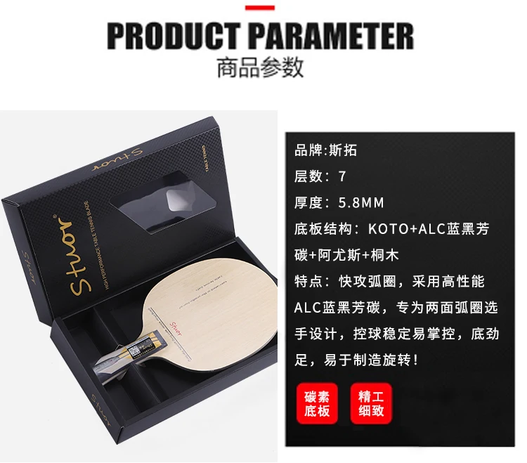 Бренд: Stuor/company Материал поверхности: KOTO Материалы: ayus Большое ядро: ayus Слой: 5 + 2 слоя ALC Толщина: около 6 мм Вес: 86-88-г Особенности: сильное ощущение руки, сильная способность Управления мячом, широкая адаптируемость, привычное к волокну и чистой древесной плинтусе