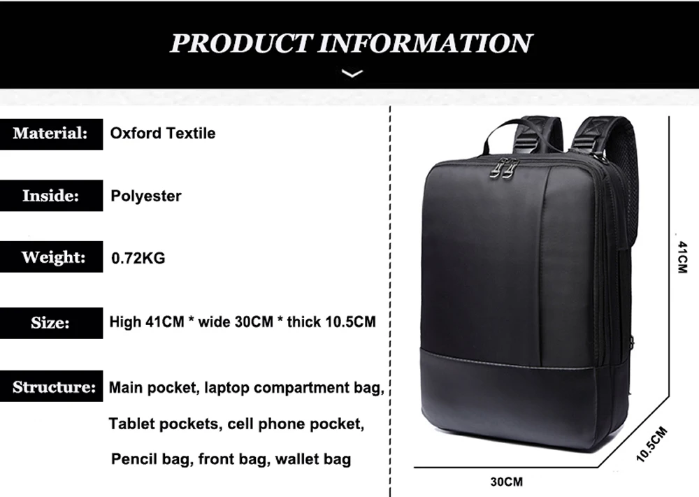 Product Style : Korean version business laptop backpack Material : Polyester Lining : Polyester Color : Black / Blue / Gray Size : Wide 30 x Thick 10.5 x High 41(cm) Weight : About 0.84kg Laptop Storage Size : 16.5 inch
