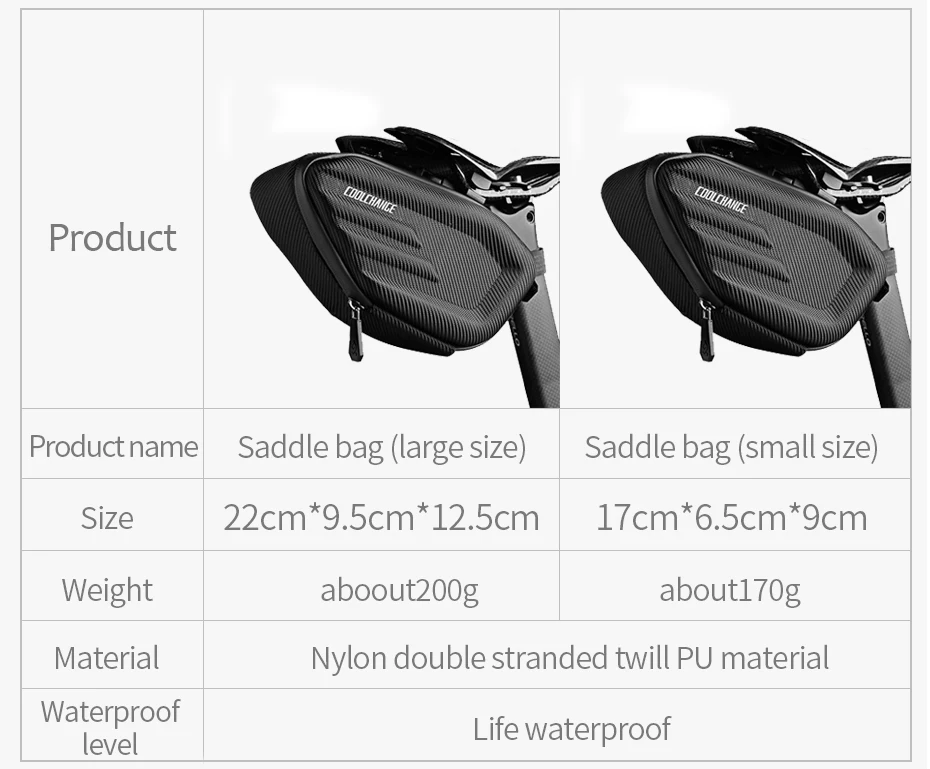 Подробнее о продукте: бренд: CoolChange Название: велосипедная сумка для сиденья Цвет: черный Вес: около 200 г размер изделия: около 22*9,5*12,5 см Материал: нейлон диагональный узор ПУ особенность: жесткий корпус водонепроницаемый, Эва Интегральная форма, на молнии, большая емкость, отражающий логотип класс водонепроницаемости: только для ежедневного использования