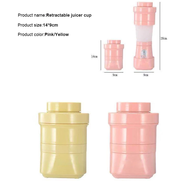 Название продукта: складная электрическая соковыжималка Тип продукта: блендер Цвет изделия: желтый/розовый Размер изделия: 14*9 см Материал корпуса чашки: пищевой силикон Напряжение: 7,4 в Емкость аккумулятора: 3200 мАч Скорость: 20001 об/мин