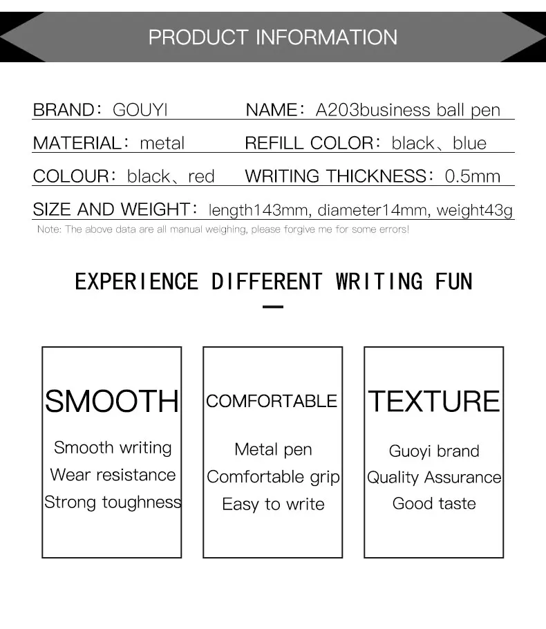 Бренды: Guoyi Номер товара: A307 Материал изделия: металл Длина изделия: 14,11 см Вес одной ручки: 53 г Вес подарочного набора: 111 г Цвет изделия: черный 0,5 мм пера Цвет письма: синий и черный