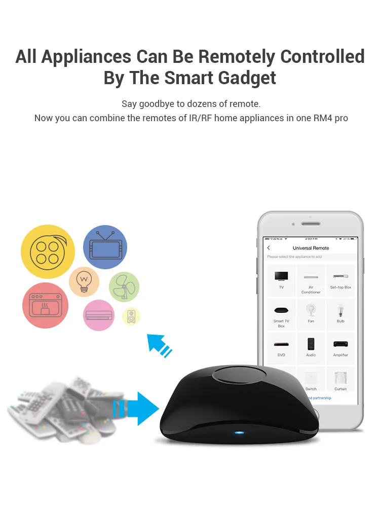 Пульт дистанционного управления работает с Alexa Google Home mini Примечание: 1. Пароль вашей WLAN не более 32 символов и никаких специальных символов, таких как пробел, тире и т. д. 2. Поддержка Wi-Fi 2,4 ГГц b/g/n (только) 3. Не подходит: ИК-сигнал с частотой 56K, Радиочастотные Устройства с кодом прокатки. 【Высокая Совместимость 】: BroadLink Wi-Fi Hub RM4 pro Поддержка RF (315 МГц и 433 МГц) контролируемые устройства, такие как умные Моторизованные электрические шторы/жалюзи/Мотор теней, проектор и выключатель на светильник; Поддержка 50000 + ИК-управляемых устройств с полной интеграции, таких как ТВ, STB, кондиционер, бытовая техника, вентилятор, видео Регистраторы, DVD, и т. д. Онлайн обновленная ИК-библиотека для обеспечения совместимости новых устройств. Возможность программировать устройства и кнопки обучения, если нет доступных облачных данных, соответствующие.