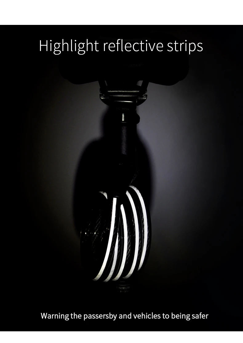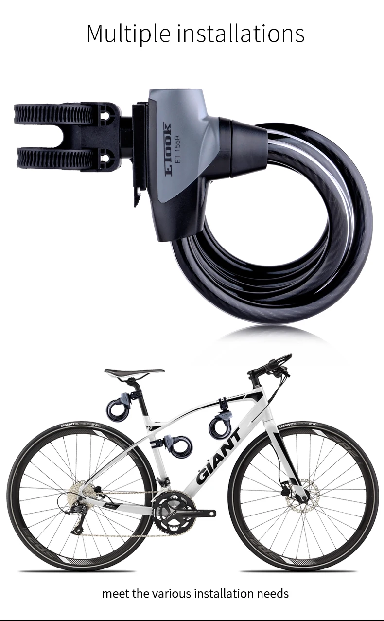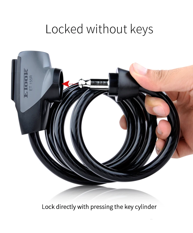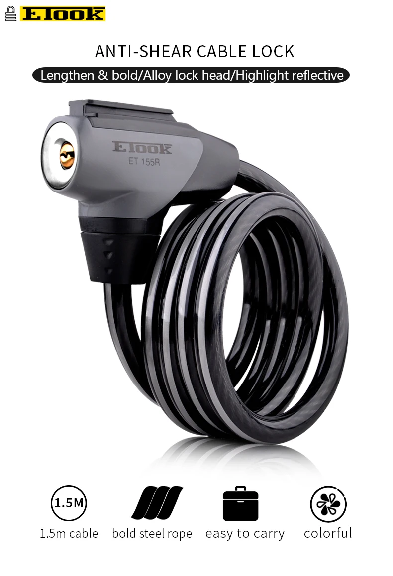 -Утолщенная СТАЛЬНАЯ ВЕРЕВКА с 6 мм. -Стопорная головка из стального сплава, утолщенный болт с 10 мм. -Высокое качество ПВХ покрытие, высокая прочность и прочность. -Выделите Светоотражающие полоски. -Сердечник из чистой меди, никогда не ржавеет. -ETOOK патентный замок cylingder, передовая Швейцарская Технология, анти-блокировка. (Не забудьте код ключа для дополнительных ключей!) -Блокировка непосредственно с помощью вставки болта. -Держатель замка с поворотом на 360 градусов. Никаких проблем с сумкой для хвоста. -Несколько мест установки.