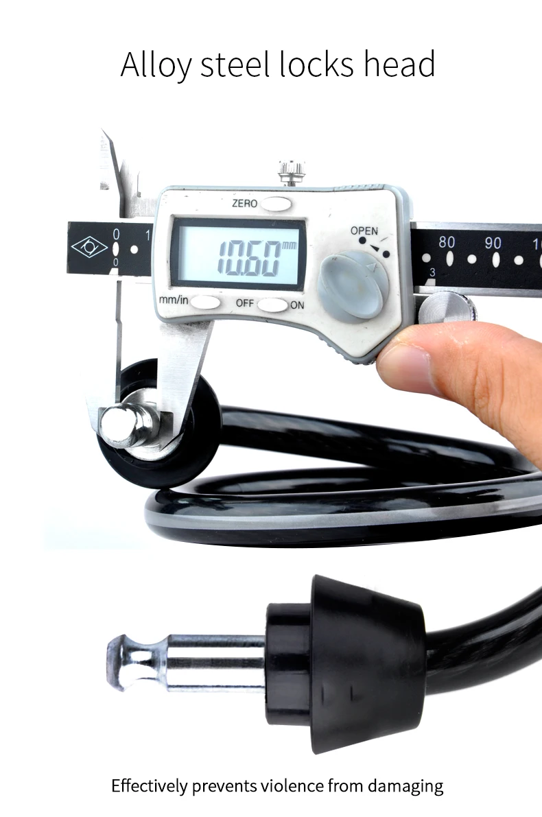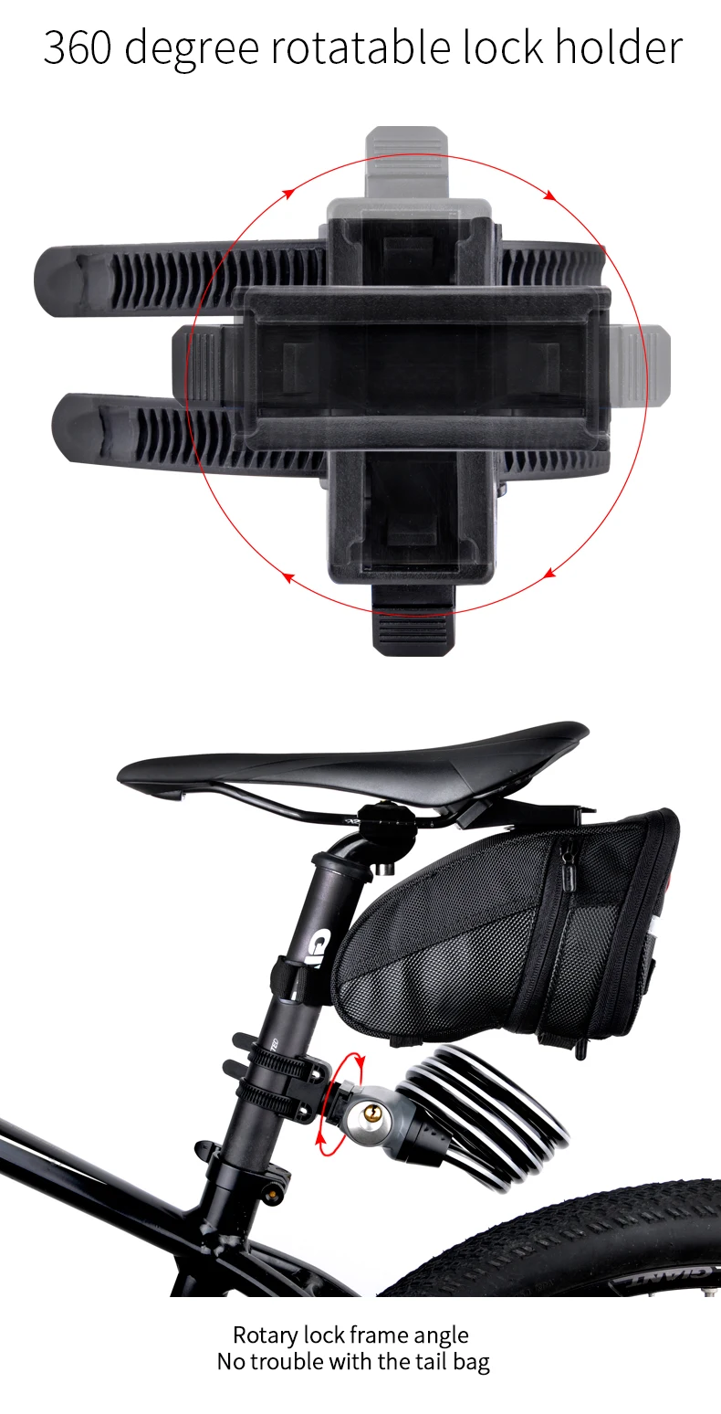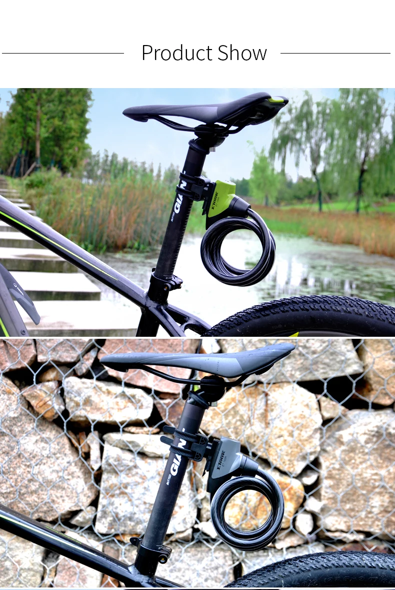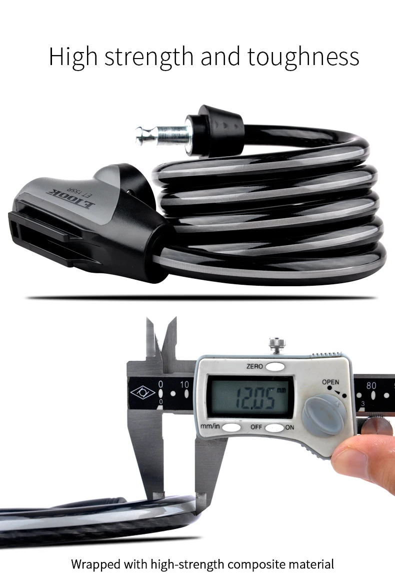 -Утолщенная СТАЛЬНАЯ ВЕРЕВКА с 6 мм. -Стопорная головка из стального сплава, утолщенный болт с 10 мм. -Высокое качество ПВХ покрытие, высокая прочность и прочность. -Выделите Светоотражающие полоски. -Сердечник из чистой меди, никогда не ржавеет. -ETOOK патентный замок cylingder, передовая Швейцарская Технология, анти-блокировка. (Не забудьте код ключа для дополнительных ключей!) -Блокировка непосредственно с помощью вставки болта. -Держатель замка с поворотом на 360 градусов. Никаких проблем с сумкой для хвоста. -Несколько мест установки.