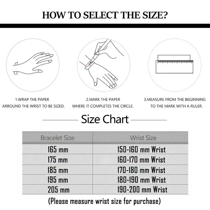 Размер браслета:Длина ношения165 мм-Подходит для окружности запястья 150-160 мм,Длина ношения175 мм-Подходит для окружности запястья 160-170 мм,Длина ношения185 мм-Подходит для окружности запястья 170-180 мм,Длина ношения195 мм-Подходит для окружности запястья 180-190 мм,Длина ношения205 мм-Подходит для окружности запястья 190-200 мм.Ширина: 12 мм