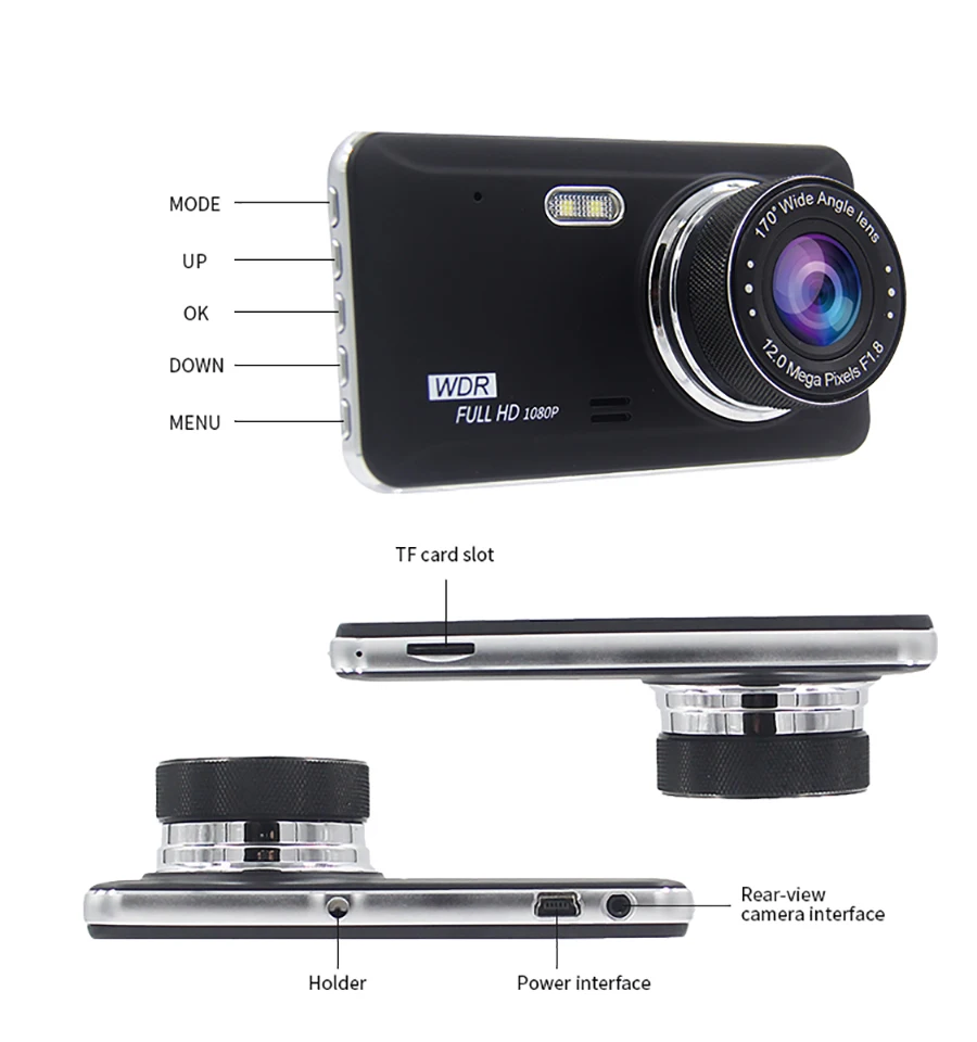 Видеорегистратор использует 6-слойный полный материал очков, так как макрообъектив делает 170 градусов + угол обзора, с диафрагмой F1.8 и 12,0 М пикселей, захватывает видео full-hd 1080p, сделайте изображение очень четким.