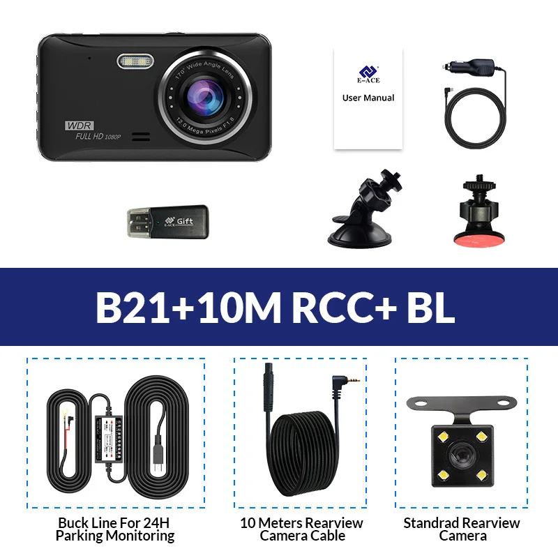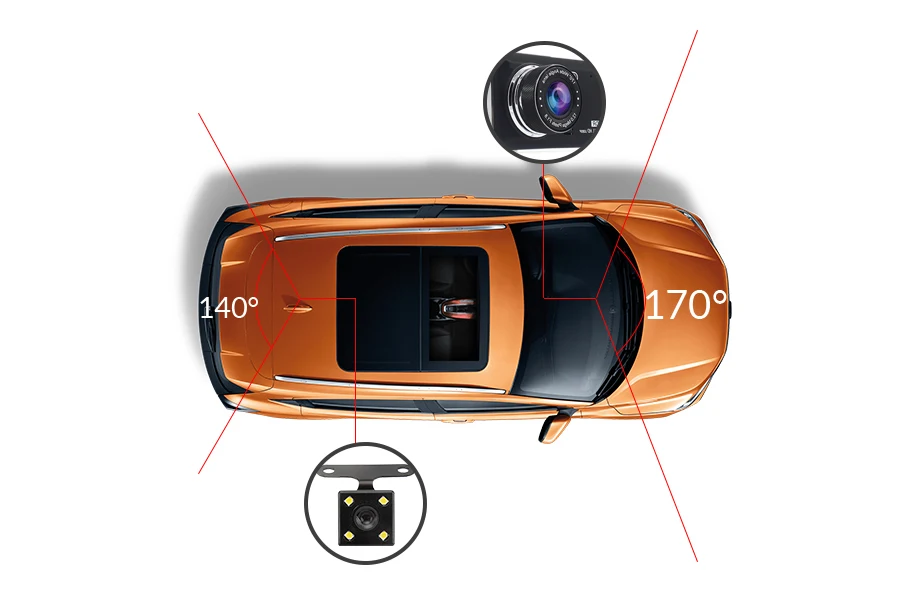 Этот автомобильный видеорегистратор имеет две камеры (опционально), что позволяет одновременно записывать видео с двух разных углов. Передняя камера 170 °. Задняя камера 140 °.