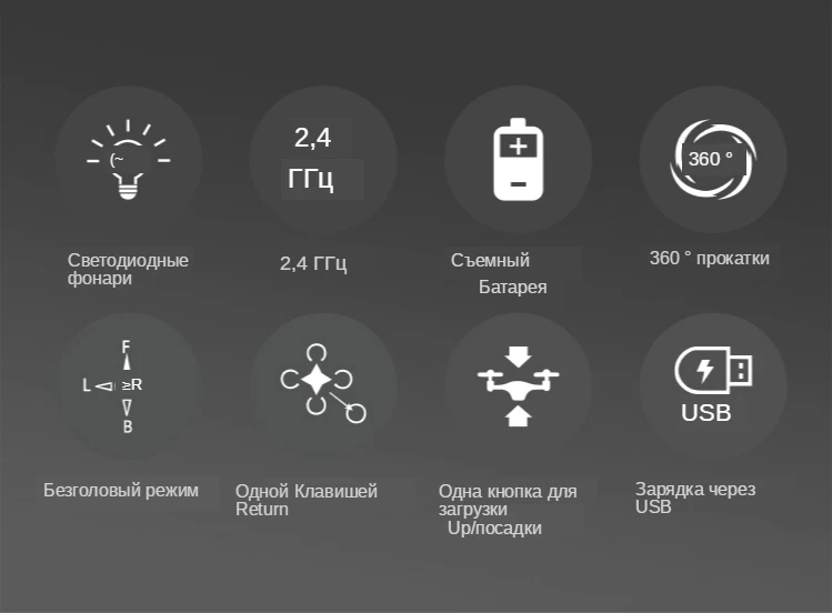 ● Светодиодный фонарь/2.4CHz/съемный аккумулятор ● Поворот на 360 градусов/Безголовый режим/возврат одной кнопки ● Одна клавиша загрузки/посадки/USB зарядки