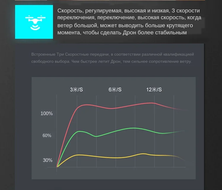 ● Встроенные Три Скоростные передачи, в зависимости от уровня знаний и свободного выбора ● Чем быстрее летит Дрон, тем сильнее сопротивление ветра.
