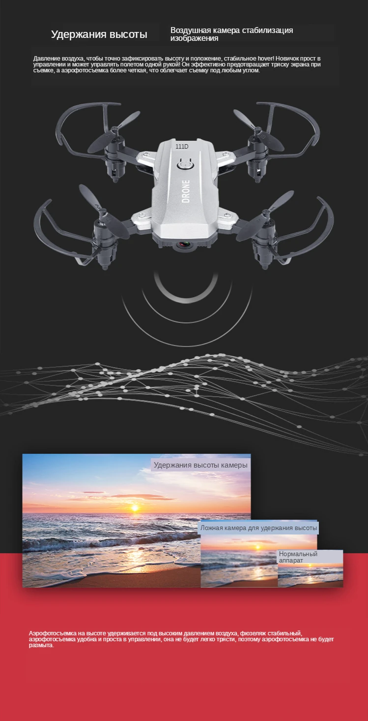 ● Давление воздуха, чтобы точно зафиксировать высоту и положение, стабильное наведение! ● Новичок прост в управлении и может управлять полетом одной рукой! ● Он эффективно предотвращает тряску экрана при съемке, а аэрофотосъемка ясна. Облегчает съемку под любым углом