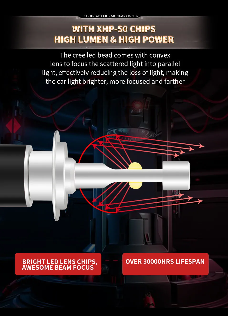 Используется высококачественная светодиодная микросхема (чипы XHP50 в США), высокая светоотдача. XPH50 чипы, чем LUMILEDS ZES.CSP.SMD.COB.DOB чип, высокое качество и длительный срок службы