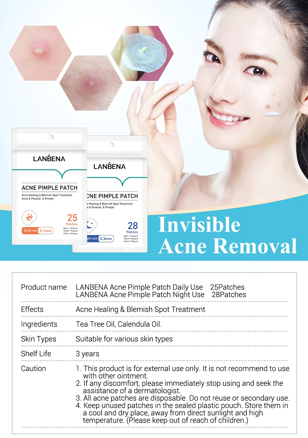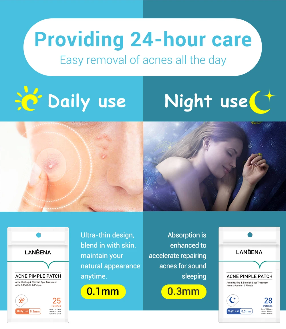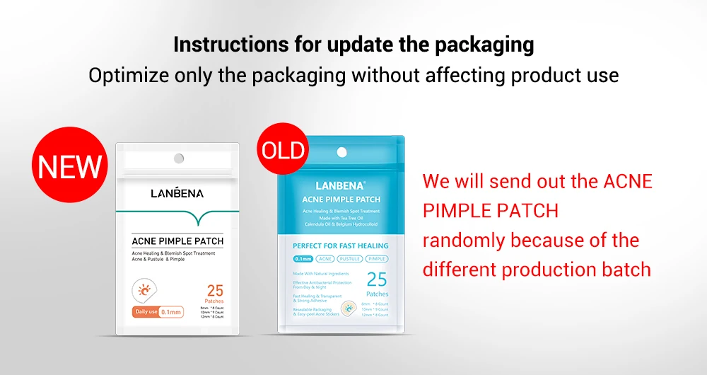 Невидимый удаления прыщей уход за кожей Название продукта: пластырь для прыщей от акне LANBENA для ежедневного использования 25 пластырей LANBENA акне прыщи патч ночное использование 28 пластырей Эффекты: лечение акне и пятна Состав: масло чайного дерева, масло календулы. Типы кожи: подходит для кожи с рубцом и прыщом Срок годности: 3 года Внимание: 1. Этот продукт предназначен только для внешнего использования. Не рекомендуется использовать С другими Широко популярная в Китае. 2. Если есть какие-либо дискомфорта, пожалуйста, немедленно прекратите использование и ищите Помощь дерматолога. 3. Все акне являются одноразовыми. Не использовать повторно или вторично. 4. Храните неиспользованные патчи в герметичном пластиковом мешке. Храните их в прохладном и сухом месте, вдали от прямых солнечных лучей и высокой температуры. (Пожалуйста, держите в недоступном для детей месте.)