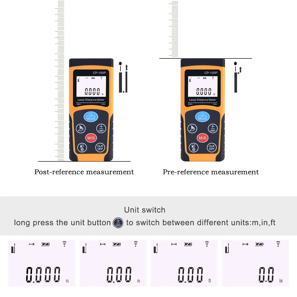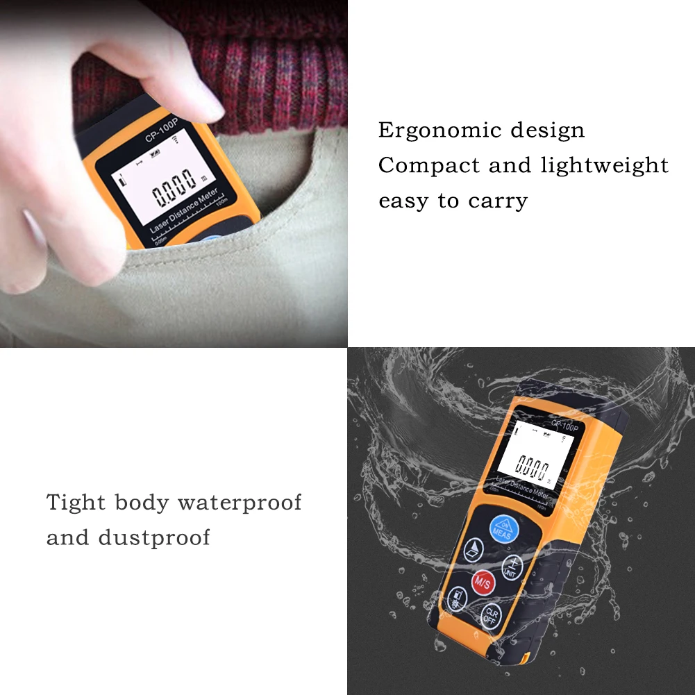 Лазерный дальномер с Диапазон измерения 0,05-100 м С уровнем воды или без Цвет: черный + синий, черный + желтый (можно подгонять) 1,6 ″ ЖК-дисплей дисплей Функция Пифагора для дистанционного измерения высоты или длины Сложение/вычитание расчет Дисплей с подсветкой показывает несколько показаний Звуковой сигнал Защита от пыли и защита от брызг к IP54 Автоматическое лазерное выключение после 30 сек Автоматическое отключение после 30 секунд без активности Расстояние измерения: 0,05-40 м Точность: ± 1,5 мм/± 0.06in Единицы измерения: m/in/ft Тип лазера: красный лазер, 635 нм, <1 мВт, класс II Рабочая температура: 0-40'C,(32-104'C) Питание от 2 батарейки ААА (не входит в комплект) Размеры: 119,4 мм * 50 мм * 29 мм Вес: 135 г