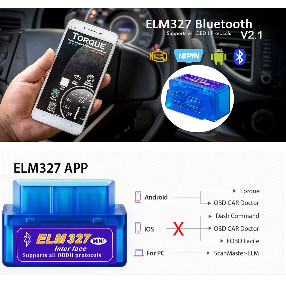 ELM327 Blueooth V2.1 фотографии: Основные характеристики: Аппаратная версия: V2.1(Поддерживает 7 протоколов OBDII) Пароль Bluetooth: 0000 / 1234 Коды неисправностей (DTCs) и четкие контрольные огни двигателя. Woks на Android Torque (Поддержка Android smart phone System с Android 4,0-Android 4,4 version) /PC( win XP/WIN 7 32 бит и закрытые антивирусные программы),Но он не работает на iOS! (Если вы хотите только IOS avaliable, пожалуйста, нажмите это:WIFI ELM327 PIC18F25K80:) Многоязычный (12 видов): Чешский, датский, немецкий, английский, испанский, французский, хорватский, венгерский, итальянский, польский, сербский, турецкий Аппаратное обеспечение V2.1 поддерживает 7 протоколов: * Настройки по умолчанию (настраиваемые пользователем) Настройки по умолчанию (настраиваемые пользователем) 1. Работает с OBD-II совместимыми транспортными средствами Функции: 1. Чтение диагностических кодов неисправностей, как общих, так и конкретных производителей, и отображение их значения (более 3000 общих кодов в базе данных). Программное обеспечение включает: Для вашей информации: Для вашего автомобиля, который будет соответствовать стандарту OBD II, он Обязательный аксессуар одежды нового сезона 16-контактный диагностический разъём (DLC) под приборной панелью и очистки выхлопных газов, Управление на наклейке «Информация» должно быть указано, что автомобиль соответствует нормам OBD II. Об этом устройстве совместимых автомобилей: Упаковочный лист: При возникновении любых проблем, пожалуйста, следуйте изображению: