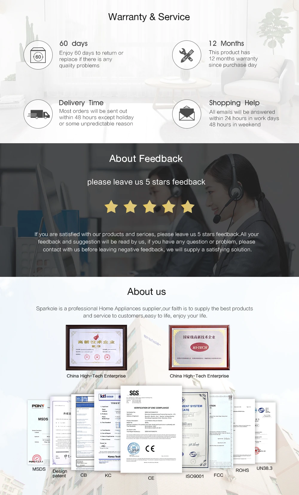 Sparkole является профессиональным производителем аккумуляторов и роботов-пылесосов и поставщиком деталей для роботов-пылесосов, расположенным в Шэньчжэне, Китай, с 2 НИОКР-центром, 15 всемирными патентами. Все аккумуляторы SPARKOLE соответствуют стандартам RoHS и CE.