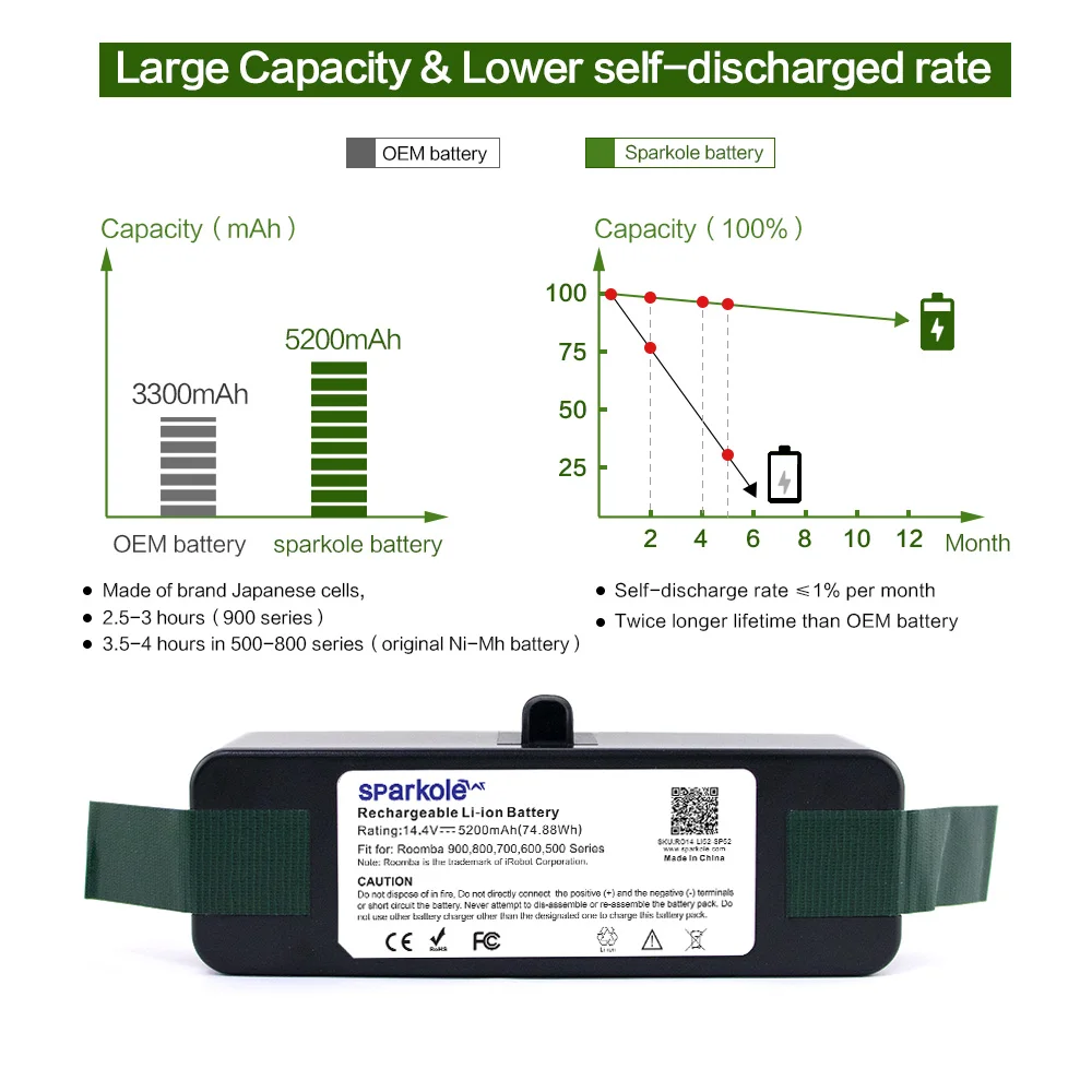 Литий-ионный аккумулятор SPARKOLE может достигать 1000 циклов, обеспечивает более длительное время работы до 3,5 ~ 4,5 часов для пылесоса iRobot Roomba.