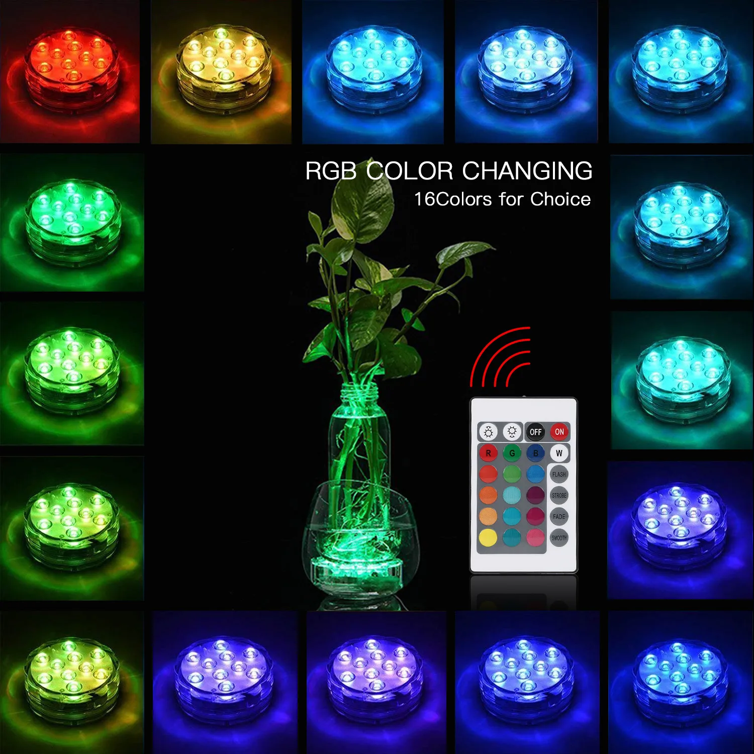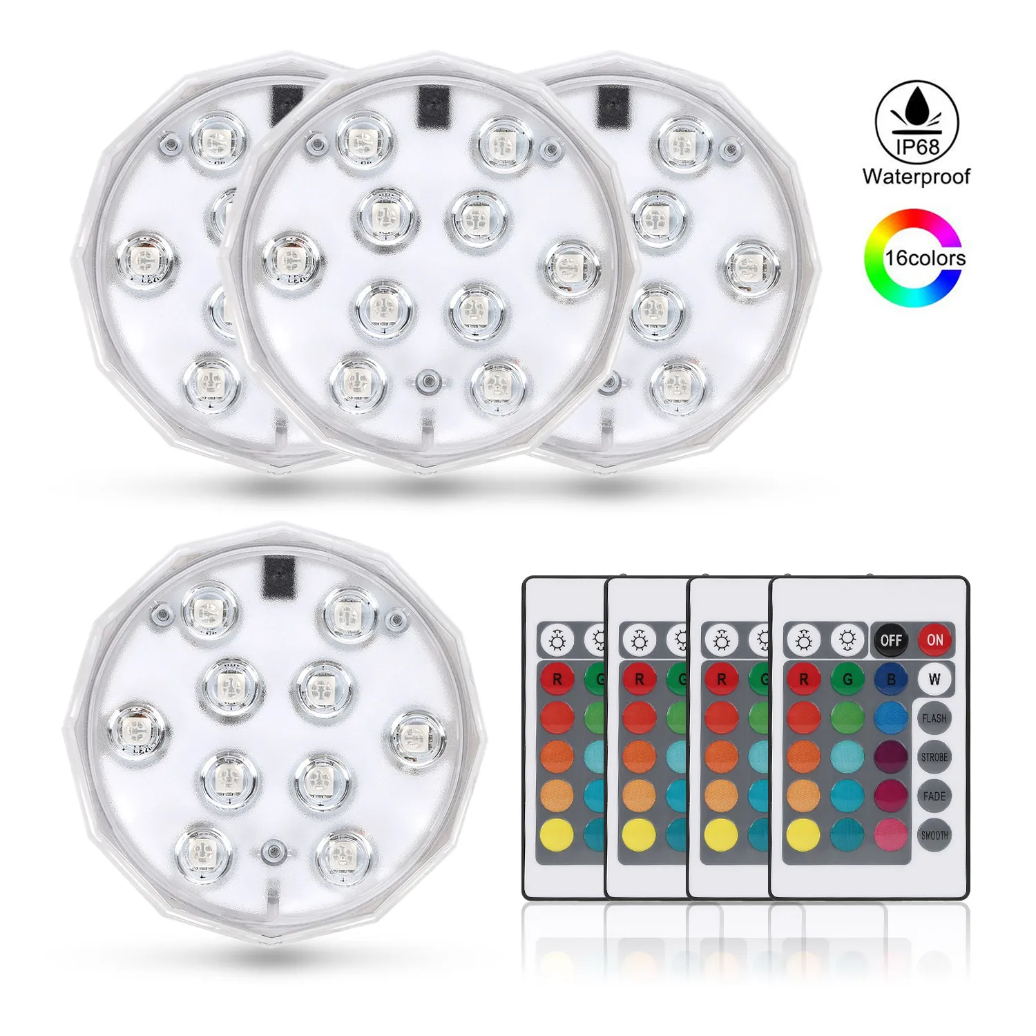 Бренд: LEDGLE Материал: PS Напряжение 4,5 в Мощность: 2 Вт Размер (прибл.): 2,8*2,8*1,2 "/7*7*3 см Источник питания: 3 * батарейки AAA (не входят в комплект) Источник света: 10*5050 RGB светодиодный бисер Водонепроницаемый: IP68 Комплектация: 4x подводный свет; 4x пульт дистанционного управления