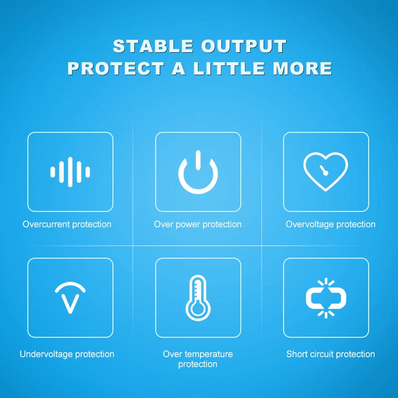 Встроенный смарт-чип, защита от перегрузки по току/перенапряжения/короткого замыкания/перегрева/низкого тока/низкого напряжения/фильтра, поддерживает турбулентный поток для поддержания режима зарядки.