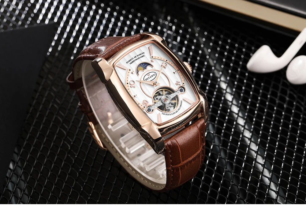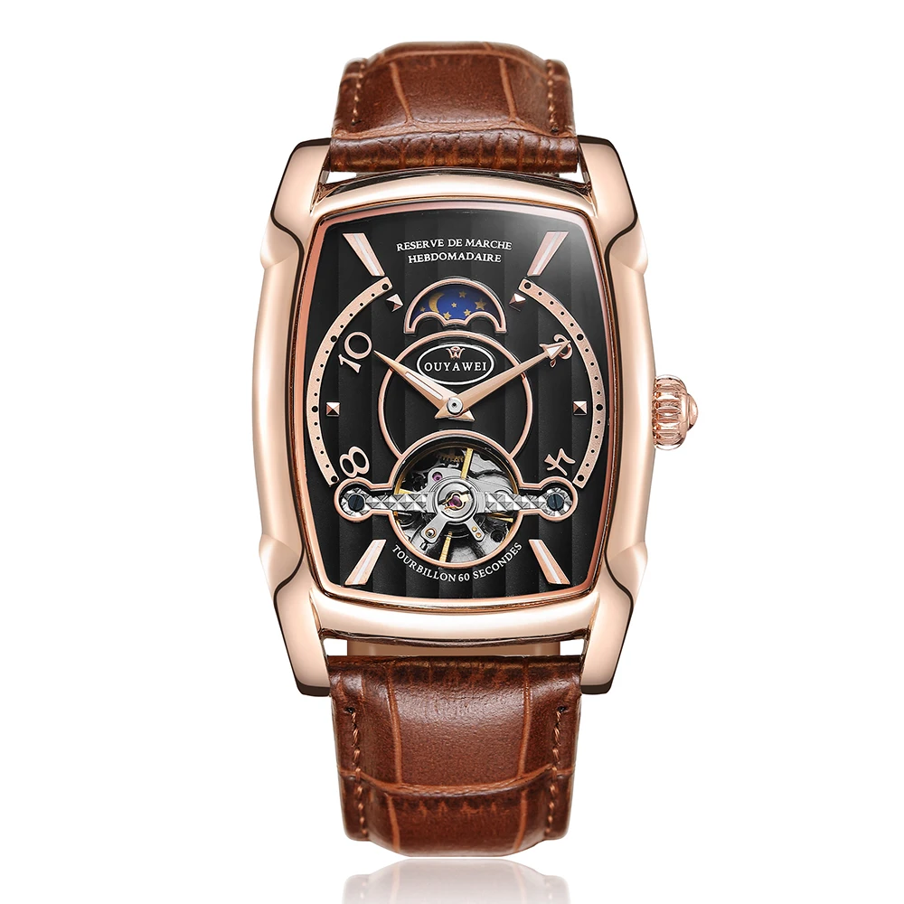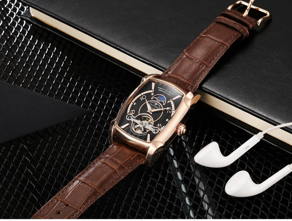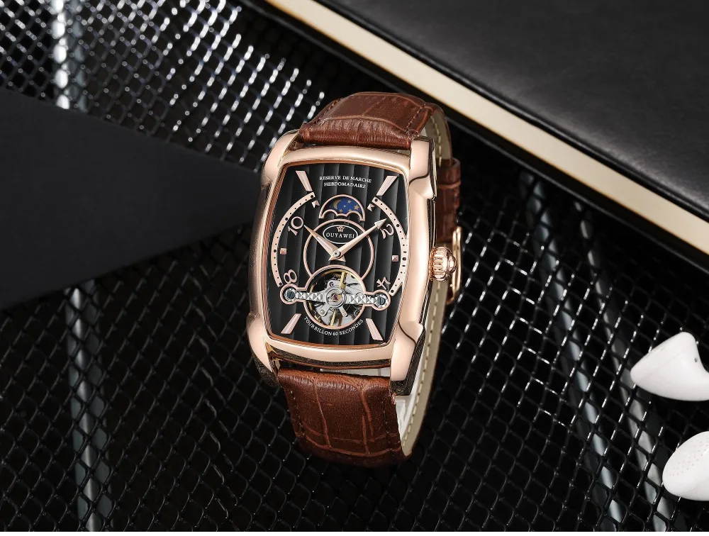 Продукт Особенности: -Винтажный tonneau образный корпус и Складчатое окно циферблата -Автоматическое движение с аналоговым дисплеем -Полый циферблат с окошком фазы Луны и Картер маховика -Высококачественный кожаный ремешок Посылка включает в себя: -Для часов-1 шт. -1 x Подарочная коробка