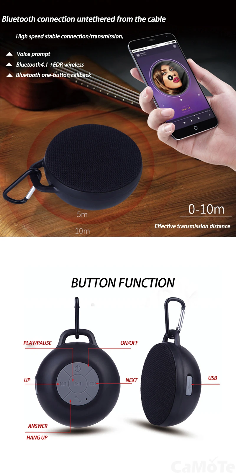 Спецификация для наружного мини портативный Bluetooth динамик Номинальная мощность: 3 Вт Батарея: 300 мА-ч Номинальный Вход: 5 В Версия Bluetooth: 2,1 Вес нетто: 140 г Размер: 40*85 мм Частотный диапазон: 100 Гц-20 кГц Время зарядки: 1 час Время игры: около 2-3 часов Функции: Стандартный патрон, Bluetooth,