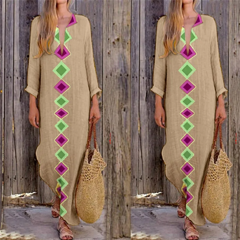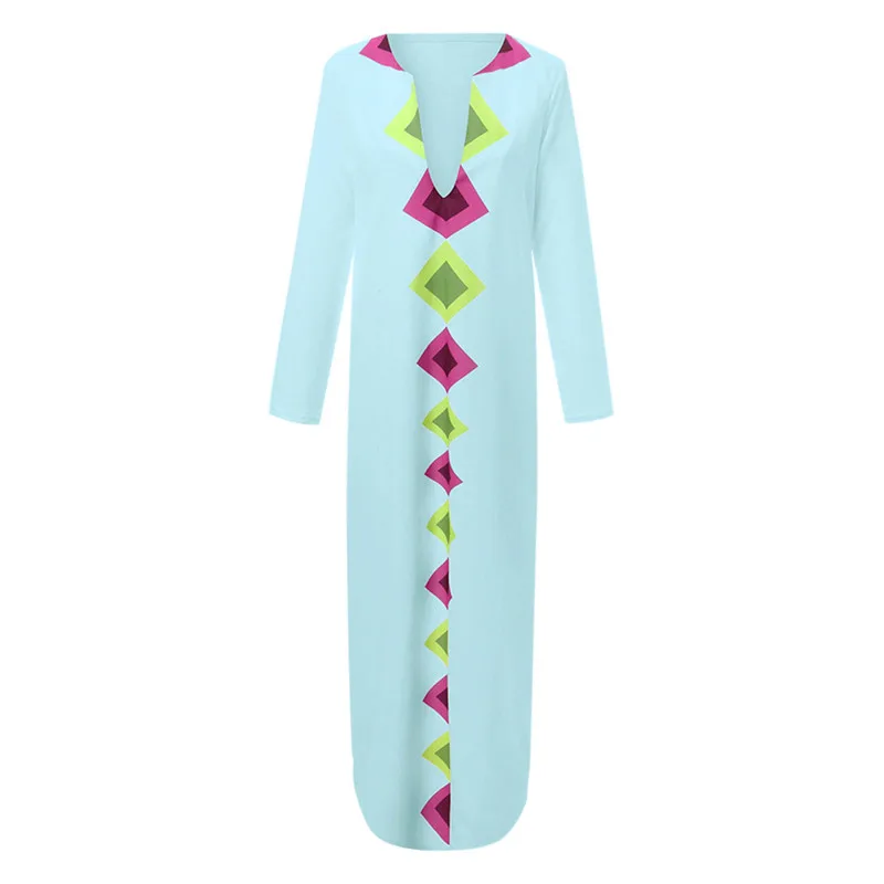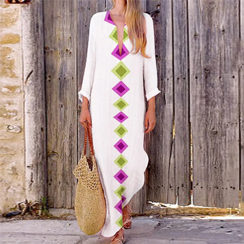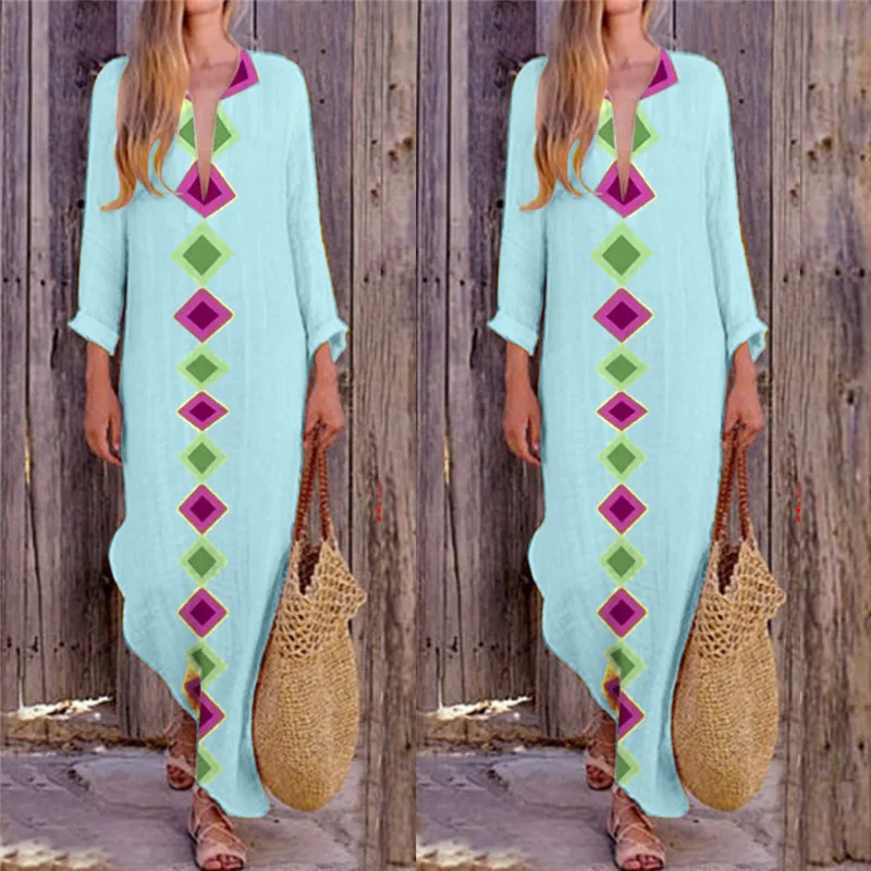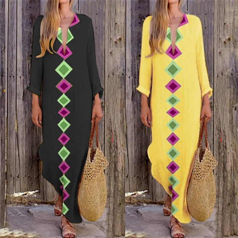 Женское платье с v-образным вырезом, богемное повседневное прямое платье макси с разрезом по бокам размера плюс, весна-осень 2019