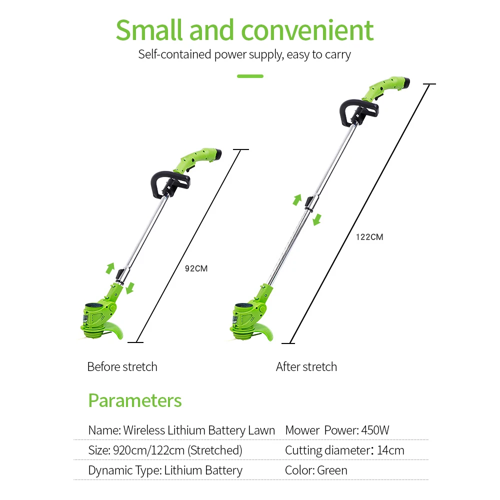 Это представляет собой многофункциональный литий-электрическая газонокосилка, беспроводной пульт дистанционного управления, может быть свободно весы для того, чтобы потребовать. Многоцелевая машина, легко решить различные свадьбы, может использоваться на вилле, дворе, общине, газоне, кампусе, паRk и другие области, выбор для садовой обрезки.