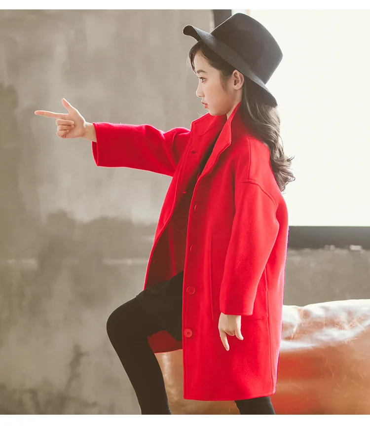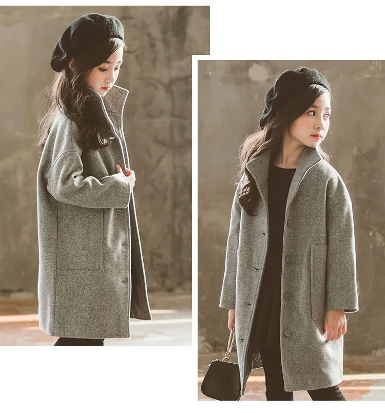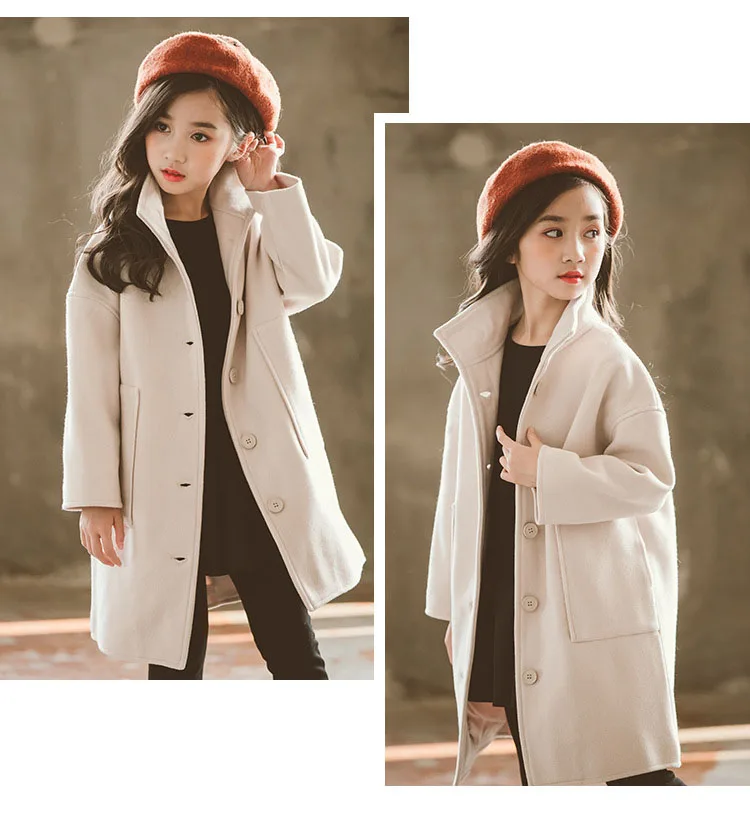 Осенне-зимнее шерстяное теплое пальто для девочек, модное длинное пальто для подростков, свободная верхняя одежда для девочек, Детское пальто с большими карманами, 2019
