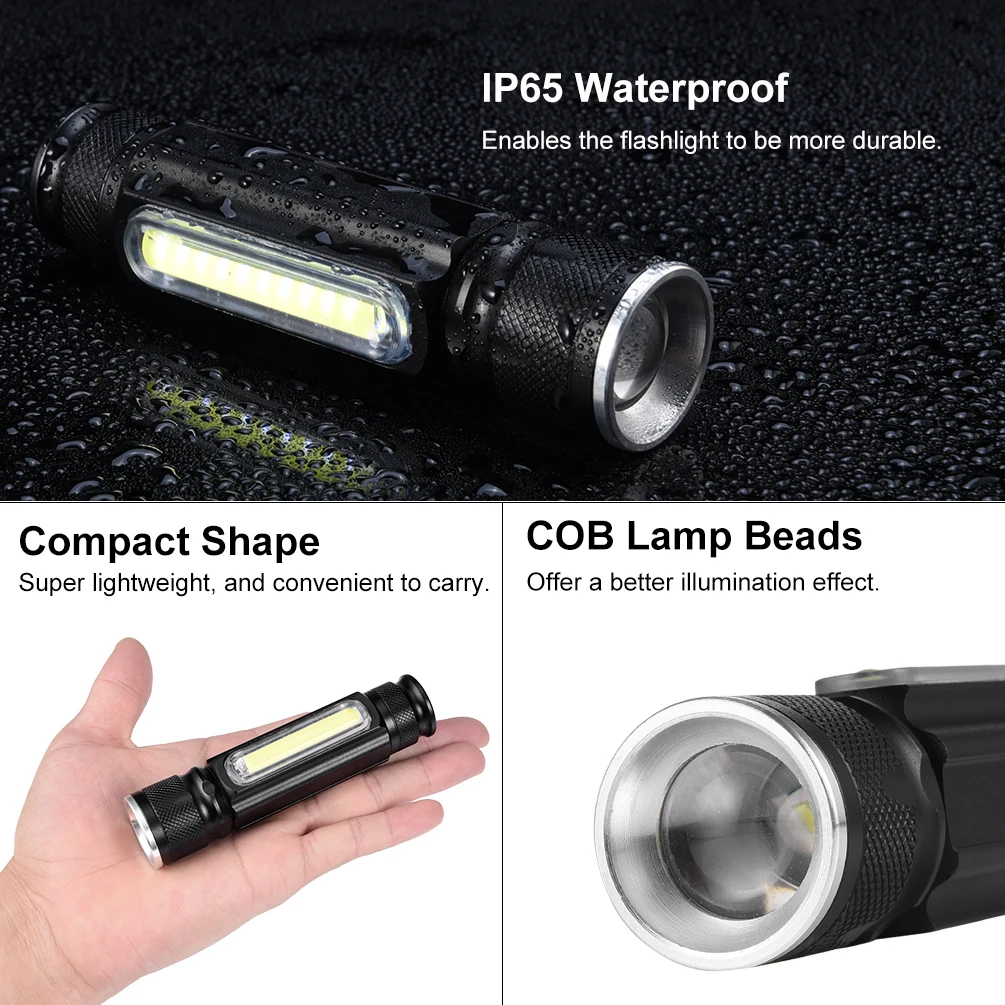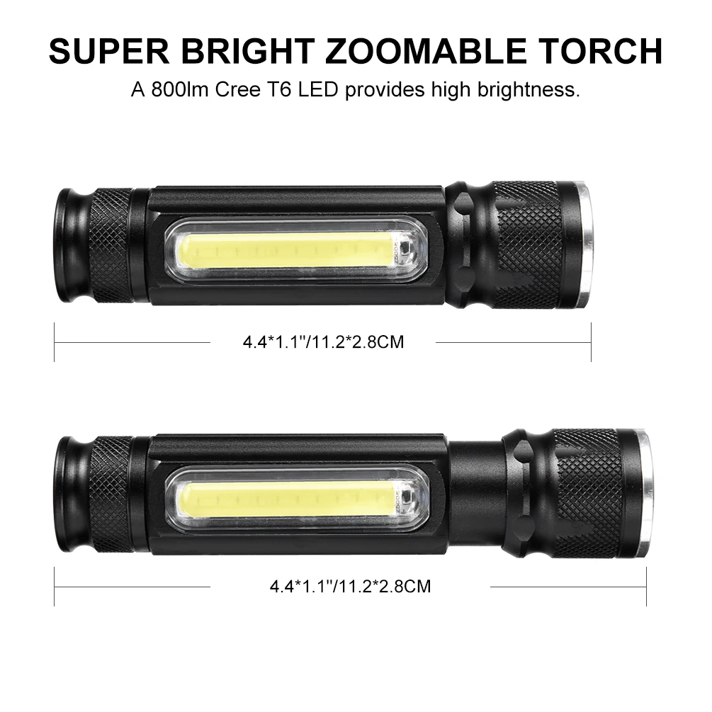 Superior превосходный материал-изготовлен из алюминиевого сплава, что делает его лучше противостоять воде, пыли, истиранию и воздействию. И светодиодный светильник красного цвета во время зарядки, когда Он поворачивается к зеленому, что указывает на то, что продукт был полностью заряжен. USB зарядка через USB-Возможность зарядки встроенного литиево-ионного аккумулятора 18650 и одной полной зарядки для непрерывного использования в течение 5-10 часов. Может также напрямую заряжать фонарик через автомобильное зарядное устройство, ПК, блок питания и адаптер. Zoomable масштабируемый дизайн-увеличение, чтобы сфокусироваться на объекте или уменьшить масштаб, потянув голову фонарика, чтобы осветить большую область. И может изменить луч фонарика, чтобы быть широким или узким по мере необходимости. Magnetic магнитное основание-позволяет фонарику прикрепить на все умственные поверхности и держать руки свободными. Кроме того, Нескользящие и портативные выступления позволяют носить, держать и повесить фонарик более удобно. ✿ 2 способа использования-фара Cree XML-T6 с максимальной яркостью 800 лм обеспечивает высокую яркость и стробоскоп, который может служить нормальным фонариком. И боковой светильник COB имеет 2 режима высокой и низкой яркости, и его можно использовать как Настольный светильник.