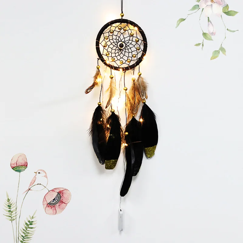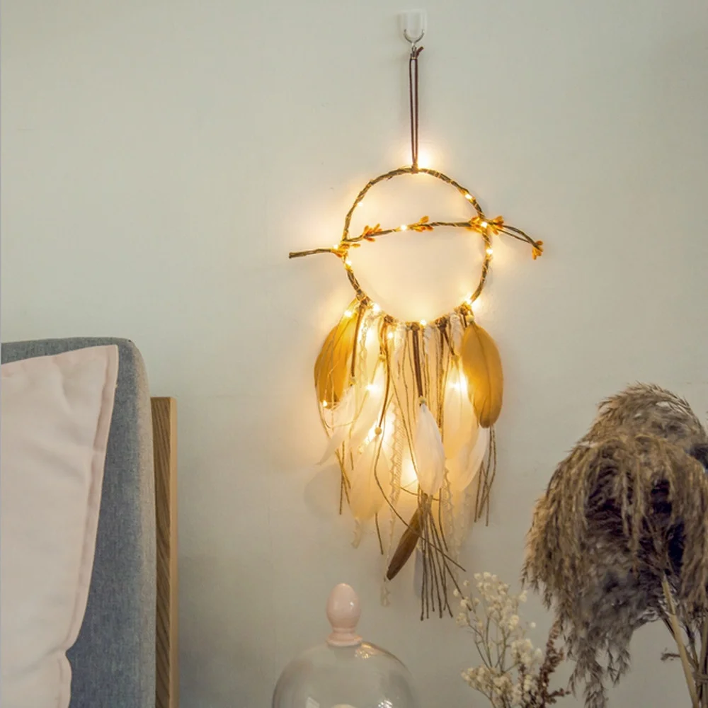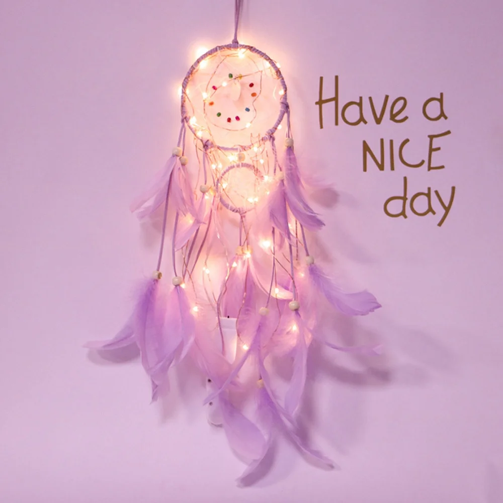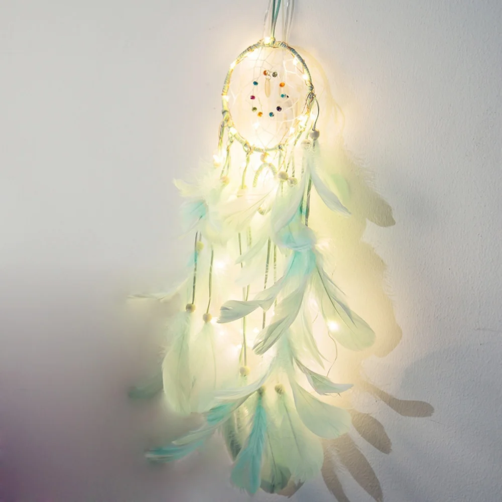 HOT DIY Feather Crafts Handmade LED Light Decorative Dream catcher Warm Light Girls Lace Wall Hanging Room Bell