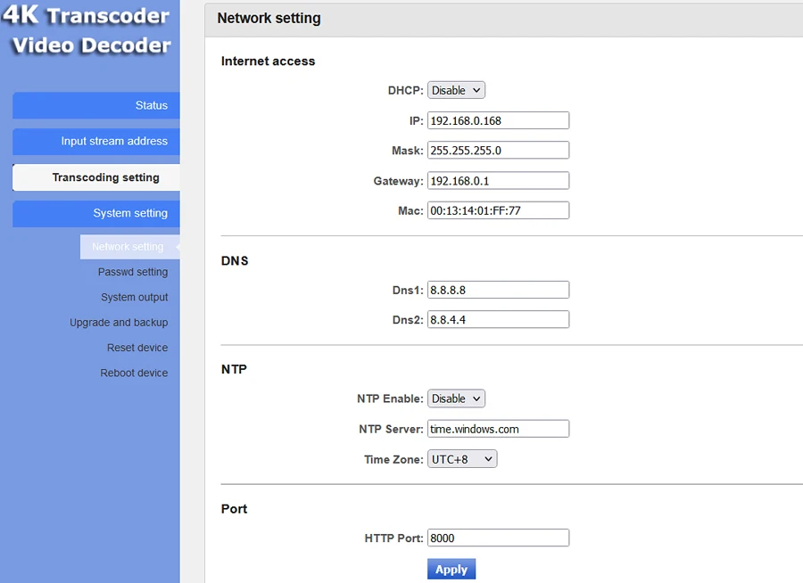 • Встроенная система HiLinux, стабильная и эффективная• Удаленное управление широкой сетью (удобное управление веб-страницей)• Поддержка декодирования и перекодирования видео H.265 /H.264•Битрейт выходного видеопотока регулируется от 32 кбит/с до 32 Мбит/с (для перекодирования)• Поддержка одновременного выхода HDMI (встроенного аудио) и CVBS(BNC) и внешнего аудио (разъем 3,5 мм)• Поддержка декодирования приставок различных брендов и IP-камер• Поддержка SRT, HTTP, RTSP, UDP, RTP, RTMP, HLS(M3U8), FLV, Unitcast, протокола многоадресной передачи• Поддержка входа и вывода видео до 4096x2160P /60fps UHD• Поддержка настройки изображения без сигнала• Сетевой интерфейс в полнодуплексном режиме со скоростью 1000 Мб• Прошивка обновляется• Поддержка пульта управления веб-страницей на английском языке и настраиваемых языков• Стабильный и эффективный, поддерживает время работы 7x24 ч• Панорамирование/NTSC на выбор для вывода CVBS• Поддержка многоканальной стойки 1U или 3U, в стойку 3U можно установить до 16 карт энкодера• Различные виды кастомизации (печать логотипа, Настройка языка, прошивка или настройка функций и т. д.)