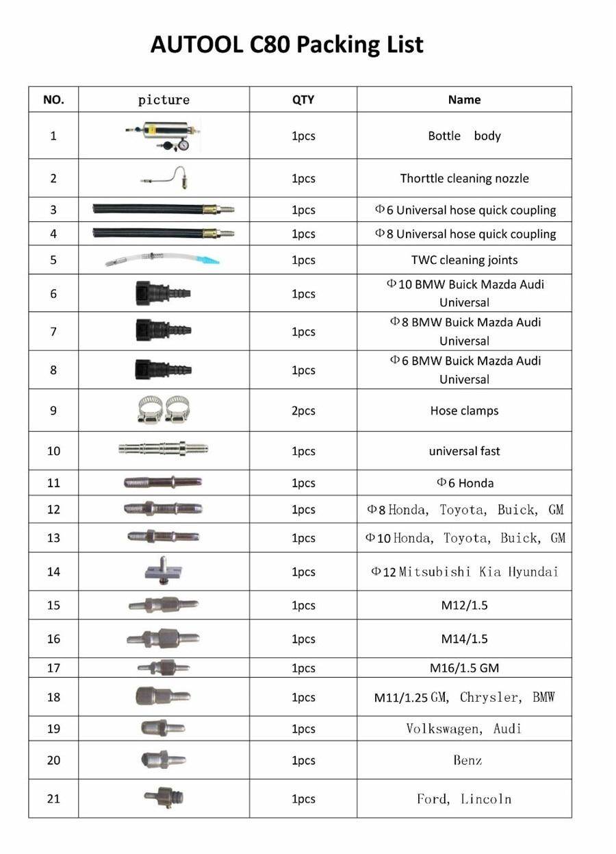 Наборы для очистки инжектора включают в себя множество различных видов адаптеров, покрывают почти все страны ЕС, Азии, автомобили США и светильник для грузовиков. Без демонтажа инжектора дроссельной заслонки и топливной системы.