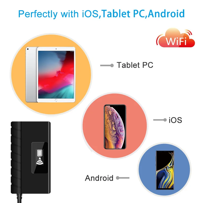 3. Совместим с устройствами IOS и Android: беспроводной и легко подключается к вашим устройствам на базе IOS или Android, просто необходимо установить приложение и подключить Wi-Fi к беспроводной эндоскопической инспекционной камере, он совместим с системными смартфонами Android 4,2 + и IOS 8 +. Он также позволяет просматривать изображения и видеозаписи компонентов непосредственно в устройстве смартфона.