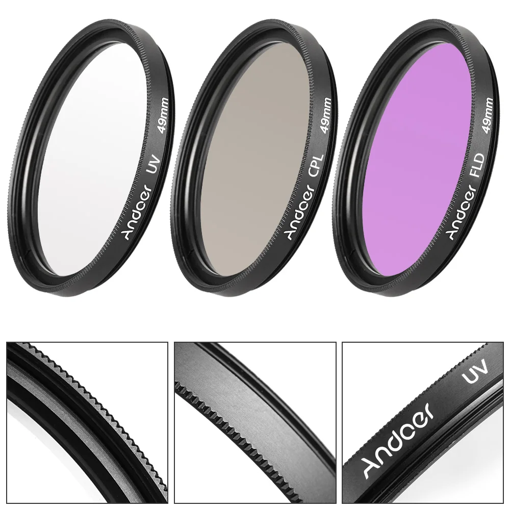 Набор фильтров Andoer 49 мм (UV + CPL + FLD) + нейлоновый чехол для переноски + крышка объектива + держатель крышки объектива + бленда + салфетка для очистки объектива