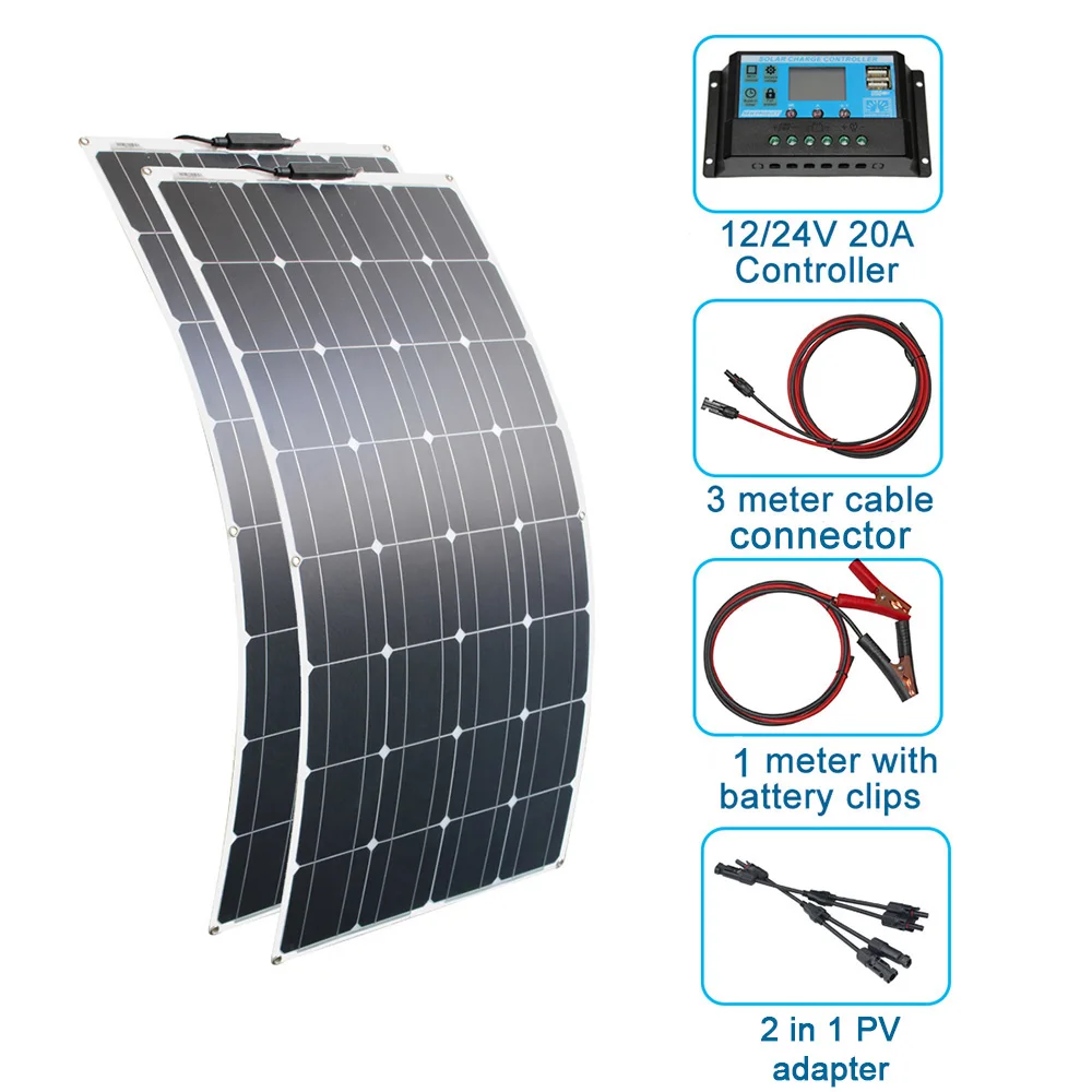 200 Вт солнечная панель системы Упаковка список 2*100 Вт солнечная панель 1*2 в 1 адаптер 1*12V/20A контроллер солнечного зарядного устройства 1*3 м кабель с водонепроницаемым разъемом 1*1 метр Кабель с зажимом аллигатора