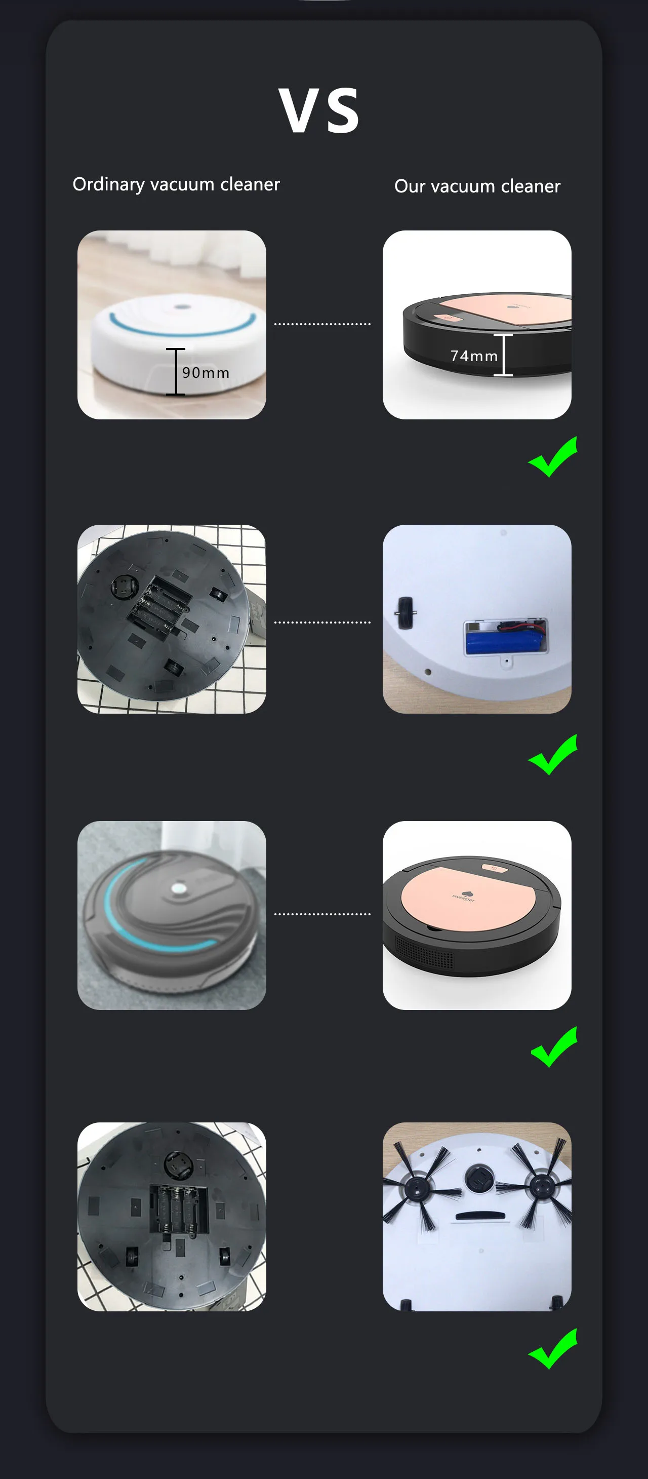 Продукт Особенности: Материал: декоративный алюминиевый профиль Размер продукта: 32x32x7,4 см/12,6x12,6x2,9 дюйма Тип: вакуумный чистый цвет Блокировка Варианты Применения: лестницы, ковры, коврики, деревянный пол мрамора, плитка пола и т. Д. Время работы: 100-180 минут Срок службы: более двух лет Сила всасывания: 1800 Pa Номинальная мощность: 3 Вт Шум: <40 дБ Время зарядки: 150 минут Площадь очистки: 150 квадратных метров Рабочее напряжение: 3,7 в Емкость пылесборника: 400 мл Вес нетто: 1,2 кг