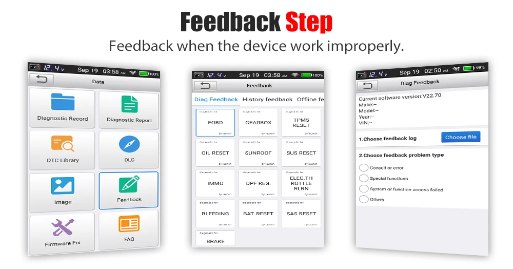 1. Зарегистрируйте новый аккаунт 2. Подключите устройство к вашему автомобилю 3. Начать диагностику