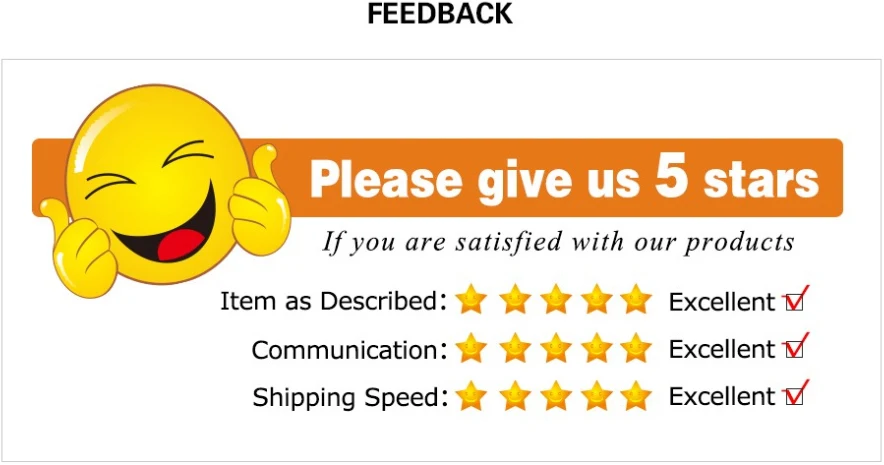 Ваше удовлетворение и положительные отзывы очень важны для нас. Пожалуйста, оставьте положительные отзывы и 5 звезд, если вы удовлетворены нашими товарами и услугами. Если вы считаете, что у вас есть какие-либо проблемы с нашими товарами или обслуживанием, пожалуйста, не стесняйтесь связаться с нами, прежде чем оставить негативный отзывы. Мы сделаем все возможное, чтобы решить любую проблему и предоставить Вам лучшее обслуживание клиентов.