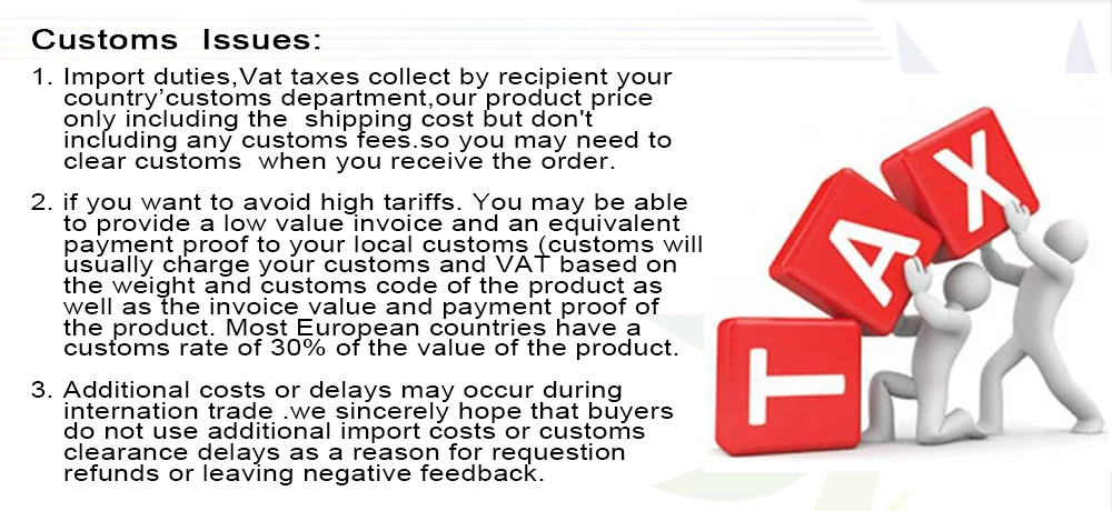Стоимость не включает налог и пошлину, когда вы получаете товары и таможня просит вас показать доказательства оплаты, если вы хотите сделать низкую налоговую стоимость, вы можете показать им небольшую сумму оплаты (купить у других aliexpress магазине). Если нет, они будут взимать плату в соответствии с вашей реальной стоимостью, чтобы оплатить ваш налог и пошлину, пожалуйста, обратите внимание. Все ТКС