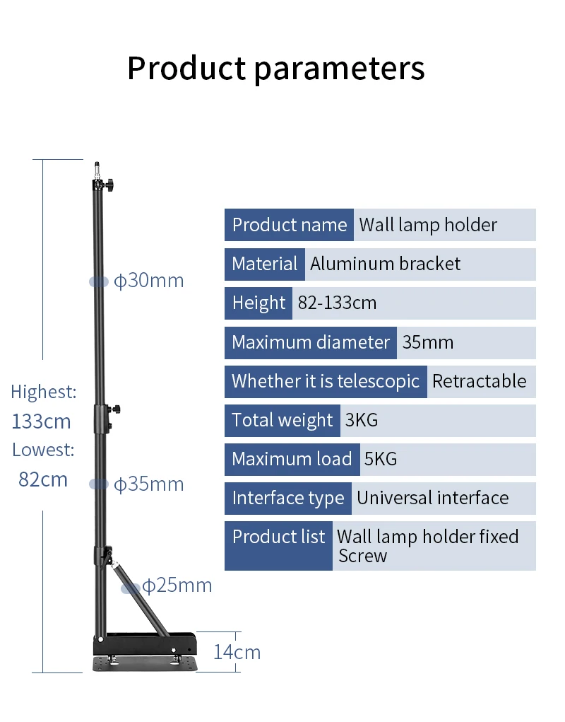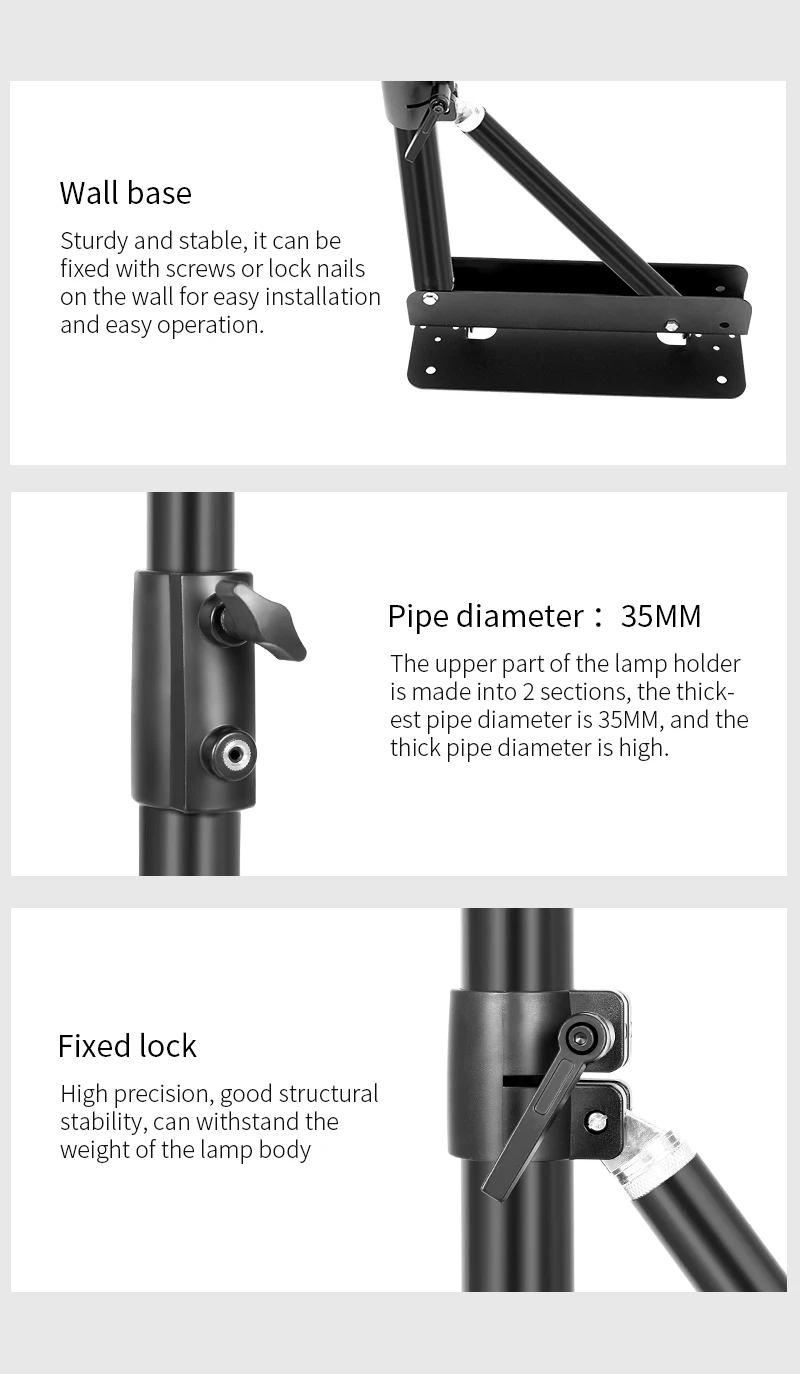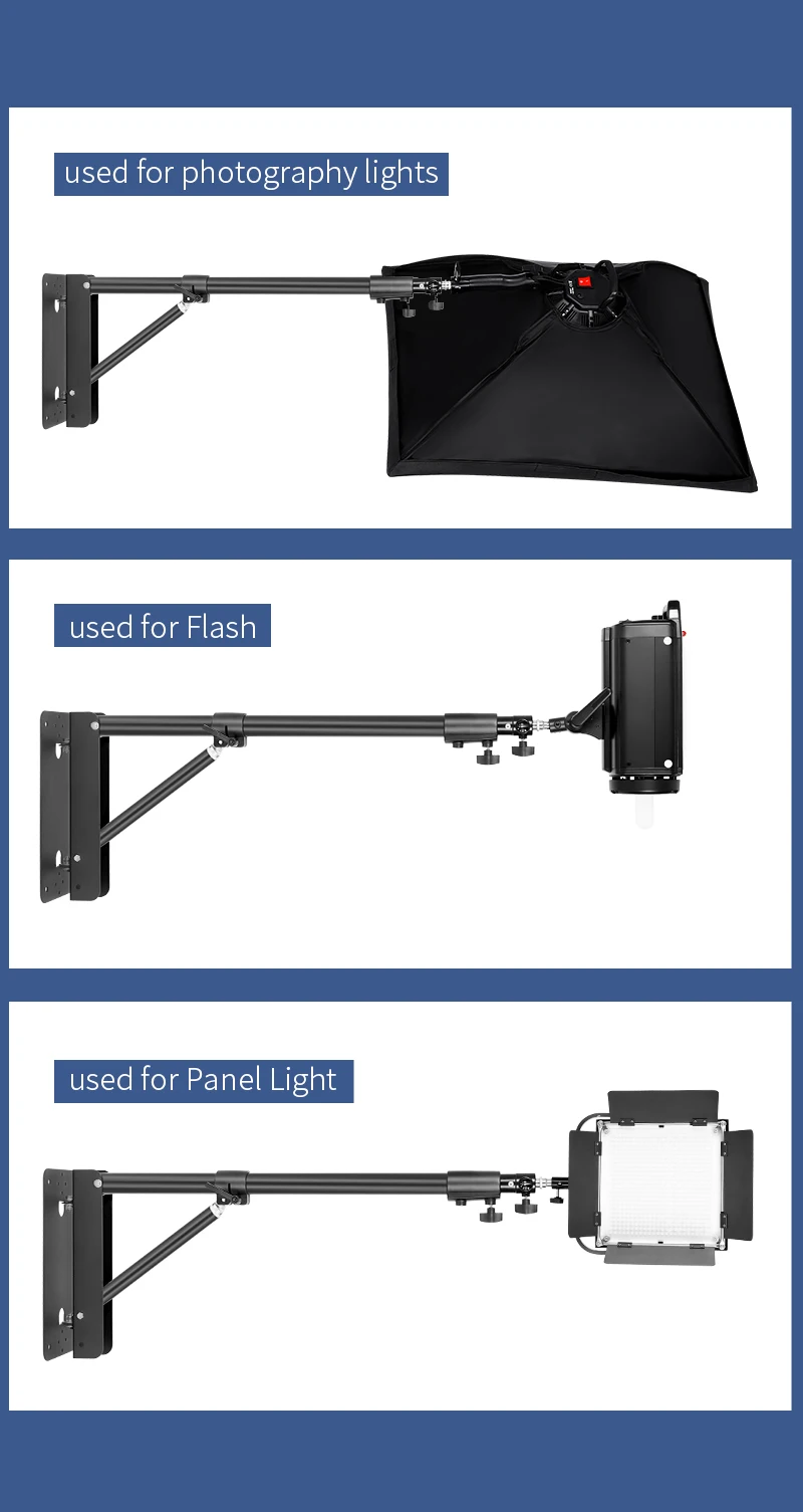 Описание продукта: Цвет: серебристый, черный Примечание: Свет не включен. Этот комплект должен быть закреплен только на твердой стене Описание: Этот кронштейн для крепления на стену идеально подходит для поддержки студийного освещения, мягкого зонта и отражателей и т. Д. Его можно зафиксировать на твердой стене, запасите больше места для вас. Рычаг стрелы можно поворачивать до 180 градусов, так что вы можете регулировать его угол и высоту синхронно. Поставляется с 4 шт. дюбеля, помогая установить стрелу на стену гораздо прочно. Конструкция в виде треугольника придает стабильность. Параметры: Максимальная высота: 52 дюйма/133 см Материал: Алюминий из алюминиевого сплава Посылка в комплект входит: 1 х стрелы на стену 4 x дюбеля