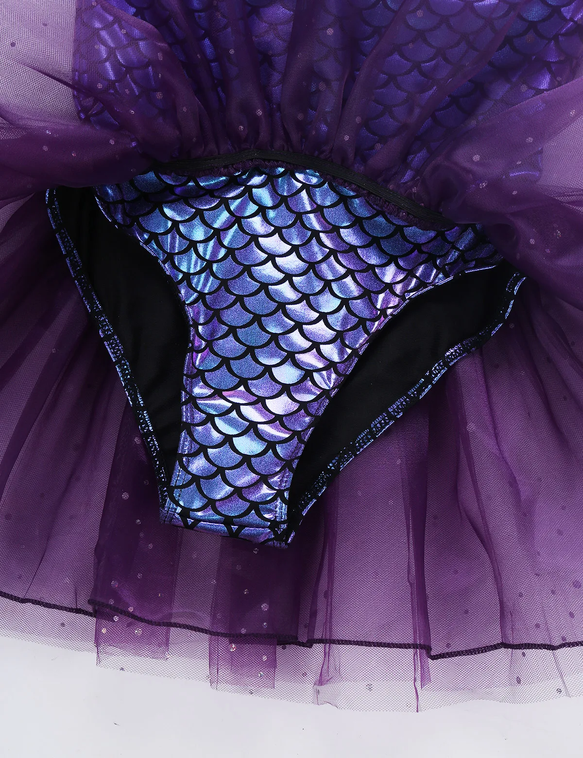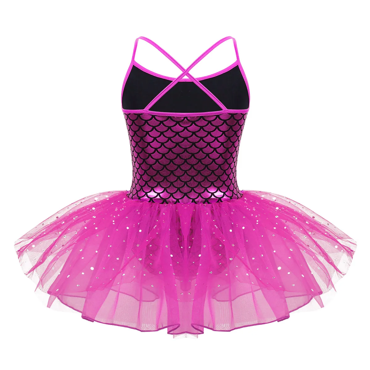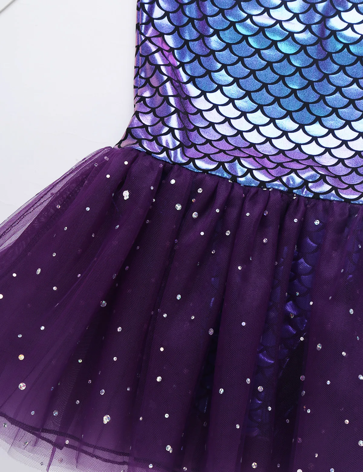 Балетное гимнастическое платье изготовлено из полиэстера и спандекса, ручная стирка. Таблица размеров означает возраст для девочек, но они предназначены только для общего руководства. Бретельки-спагетти, блестящая Русалка, топ с лифом с принтом в виде рыбьей чешуи. 3 слоев гофрированной юбкой крепится вокруг талии. 2 слоя сетки, Верхний сетчатый слой с блестками, 1 слой органзы. Подходит для праздничных платьев, занятий танцами, гимнастическое упражнение, выступлений на сцене и т. д.