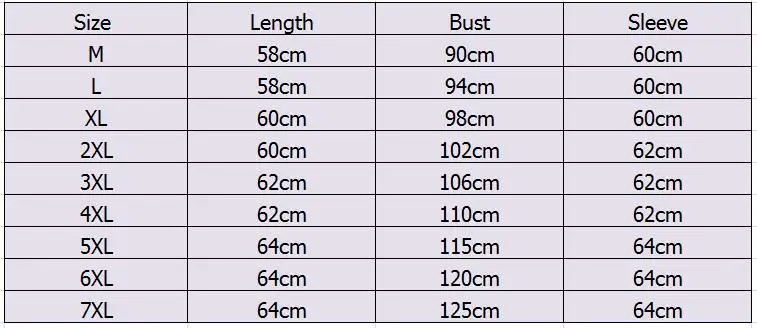 M: Длина: 58 см бюст: 90 см рукав: 60 см L: Длина: 58 см бюст: 94 см Рукав: 60 см XL: длина: 60 см бюст: 98 см рукав: 60 см XXL: длина: 60 см бюст: 102 см рукав: 62 см 3XL: длина: 62 см бюст: 106 см рукав: 62 см 4XL: длина: 62 см бюст: 110 см рукав: 62 см 5XL: длина: 64 см бюст: 115 см рукав: 64 см 6XL: длина: 64 см Бюст: 120 см рукав: 64 см 7XL: длина: 64 см бюст: 125 см рукав: 64 см