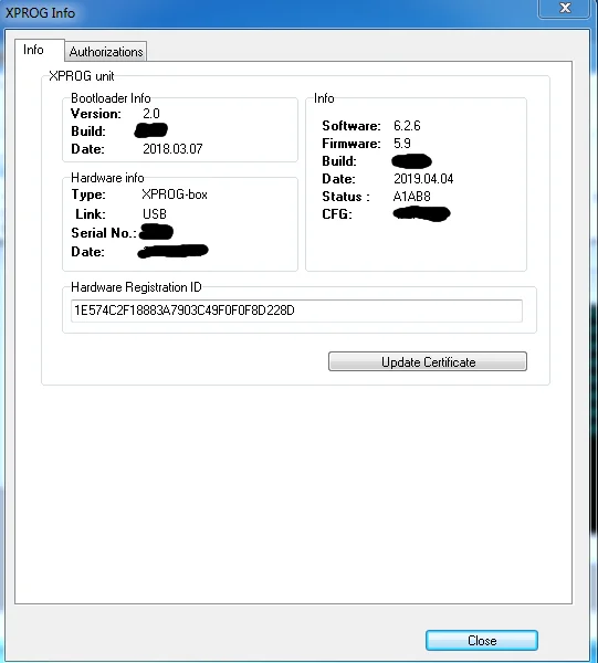 XPROG-M V6.12 с помощью подсказок: 1. Ключ XPROG V6.12 не совместим с более старой версией Xprog. 2. Закройте все антивирусное программное обеспечение на вашем компьютере, потому что антивирусное программное обеспечение убивает Xprog V6.12 драйвер. 3. Отключите Интернет. В противном случае Интернет может повредить оборудование XPROG. 4. Удалите все старые версии программного обеспечения XPROG перед установкой программного обеспечения V6.12, потому что оборудование XPROG V6.12 не совместимо с другими версиями программного обеспечения XPROG. 5. Никогда не пытайтесь обновить его, оборудование будет повреждено, если вы попытаетесь обновить его онлайн. Установите Обратите внимание: Пожалуйста, система windows требуется как показано ниже: 1. Система Windows должна быть windows XP 32bit или windows 7 64 bit, все патч-программное обеспечение для системы windows должны быть установлены уже и windows правильно работает... 2. Система windows должна быть с двумя разделами (кроме CD ROM.) 3. Не может работать с Виртуальным жестким диском. Инструкции по установке словами: 1. Нажмите файл «Установка. reg», получите информацию о файле в regedit. 2. Установите файл "adberdr11000_zh_inter exe", это обязательное, в противном случае программное обеспечение Xprog не запустится. 3. Подключите основной интерфейс Xprog к компьютеру, установите драйвер USB. 4. Скопируйте папку «XPROG-BOX6.12» на рабочий стол и откройте ее и запустите «xprogdesktop.exe», а затем Откройте программное обеспечение. XPROG V6.12 разрешения: AUTH-0001 Motorola HC05 семейное разрешение (позволяет читать/писать EEPROM) AUTH-0002 Motorola HC08 семейное разрешение (позволяет читать/писать EEPROM) AUTH-0003 Motorola HC11 семейное разрешение (позволяет читать/писать EEPROM) AUTH-0004 семейное разрешение Motorola HC12, 9S12 (позволяет читать/писать EEPROM и флэш-память) AUTH-0005 Texas Instruments TMS370/TMS374 семейное разрешение (позволяет читать/писать EEPROM) AUTH-0006 Motorola HC05Bxx и HC05Xxx семейное обозначение безопасности (позволяет считывать/записывать защищенную EEPROM и флэш-память) AUTH-0007 ST M35080 авторизация. Считывание/запись/стирание устройства в состояние доставки. AUTH-0008 BMW EWS3 авторизации AUTH-0009 авторизация семьи ATMEGA (позволяет читать/писать EEPROM и флэш-память) AUTH-0010 MB ZGS001 авторизации AUTH-0011 Motorola HC11EA9/E9 bypass авторизация безопасности (позволяет обойти бит безопасности и считывать память EEPROM и RAM) AUTH-0012 национальное разрешение CR16 (позволяет считывать/записывать память EEPROM) AUTH-0014 ST7, ST10 семейное разрешение (позволяет читать/записывать внутреннюю вспышку) AUTH-0015 авторизация MPC5xx (в зависимости от программы устройства автоматически определяет MPC5xx, M95xxx тип устройства, флэш-память, внешняя вспышка и размер памяти конфигурации) AUTH-0018 Motorola HC12, HC912, MC9S12, MC9S12X обойти разрешения безопасности (позволяет считывать/записывать защищенные EEPROM и флэш-память) AUTH-0020 ARM (микроны, ...) Семейное разрешение (позволяет считывать/записывать внутреннюю вспышку и внешний серийный EEPROM) AUTH-0021 ARM (микроны, ...) Семейное обозначение безопасности (позволяет считывать/записывать защищенную и незащищенную внутреннюю вспышку и внешний серийный EEPROM, просмотр/изменение пробега, номер шасси (VIN), серийный номер и пин-код). AUTH-0023-1 MAC7xxx AUTH-0023-2 XC23xx AUTH-0024-1 MC9S12Cxx AUTH-0024-2 MC9S12XE AUTH-0024-3 9S12XE безопасности AUTH-0024-4 MC9S12HA/HY/P AUTH-0025-1 MPC/SPC5xxx уполномоченный 2016/3/13 AUTH-0027-1 HC(S)908 обновление авторизованного 2016/3/13 AUTH-0027-2 HC(S)908 sercurity авторизованный 2016/3/13 AUTH-0028-1 Renesas V850 уполномоченный 2017/10/9 AUTH-0028-2 авторизованный 2017/10/9 Renesas SuperH AUTH-0028-3 Renesas RL78 авторизованный --- Новый! AUTH-00