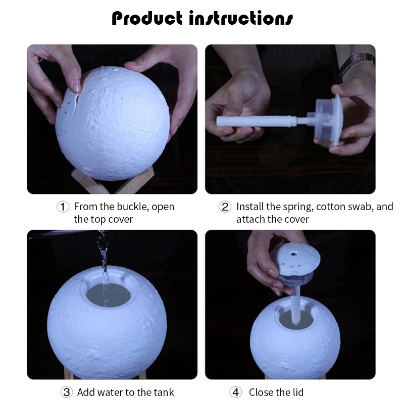 Подробная информация о продукте Название продукта: лунный светильник увлажнитель воздуха Материал ПВХ/ПП + электронные компоненты Размер изделия: 13 см в диаметре Упаковка продукта: 140*140*160 мм Один вес нетто/вес брутто 400 г/310 г (245 г без кронштейна) Цвет: белый Вход напряжение: DC5V Потребляемая мощность: 2 Вт Объем распыления: 25-35 мл Емкость резервуара для воды: 880 мл Продолжительность распыления: 25-35 мл