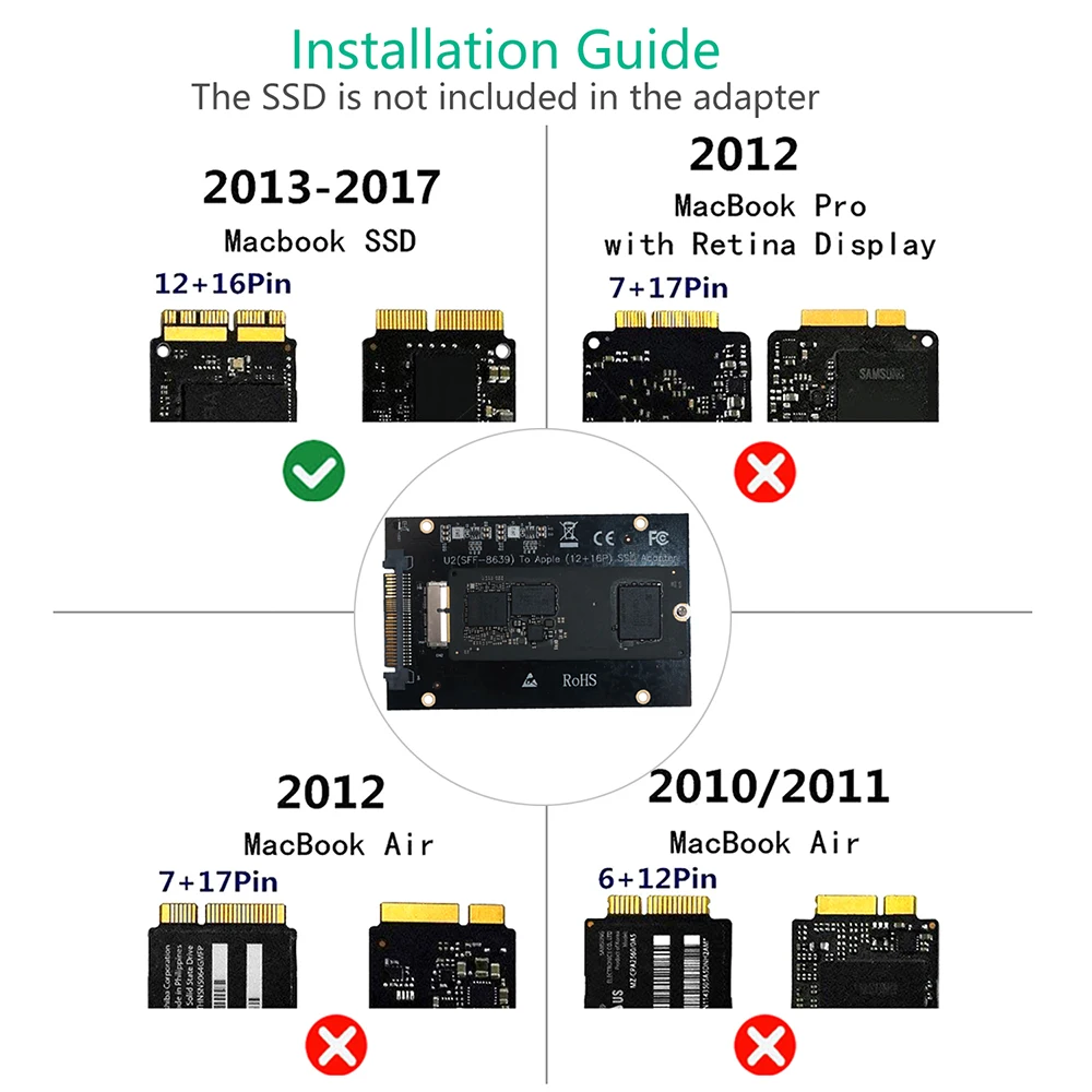 1. Этот адаптер используется для преобразования MacBook Air Pro Retina в 2013 ~ 2017 версия SSD SFF-8639 U.2 интерфейс, не интерфейс SATA.