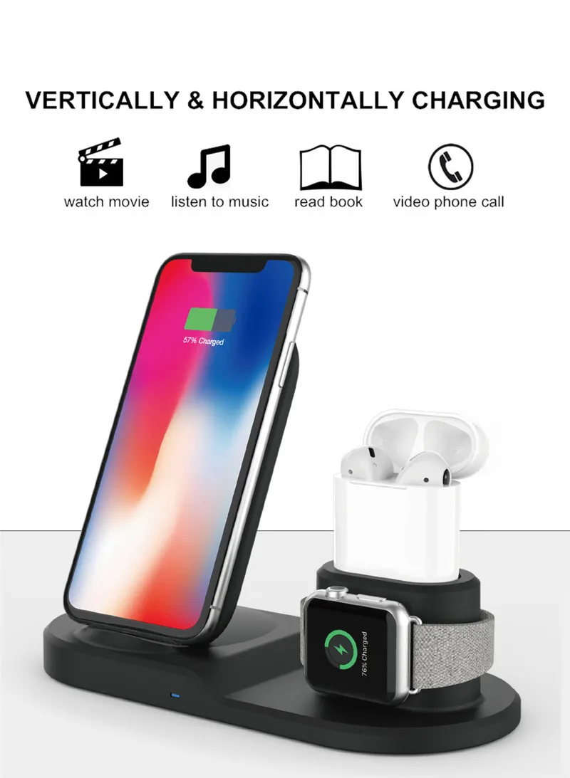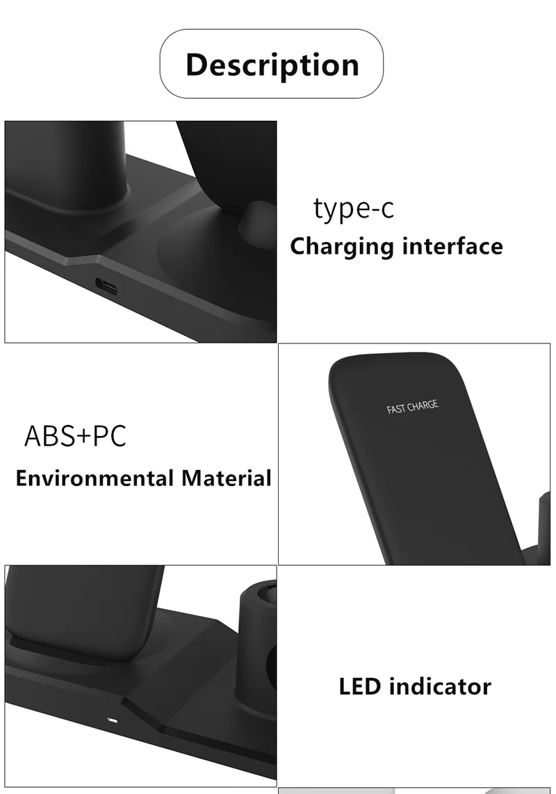 One charging dock safely charges For Apple Watch and For Qi-enabled devices at the same time Used for battery wireless charging or wireless power supply. For Apple can support fast charging 7.5W For Samsung can support 10W fast charging Temperature protection ( the battery is automatically protected at high temperature ) Short-circuit protection ( automatically cut off current for protection during short-circuit ) Over-voltage protection ( effectively set the voltage during the battery charge and discharge ) Specification: Interface: Type-C Color: Black, White Material:PC+ABS silicone Input: 9V 2A Output: Smartphone:9V 1.1A,7.5W,5V 1A; For Apple Watch:2W Charging Power:10W, 7.5W,5W; 2W Efficiency: Over 73% Standard: Qi Standard Overvoltage protection,Overcurrent protection,Over-temperature protection Compatible with: 7.5W: For Xiaomi MIX 2S , iPhone 8,iPhone 8 plus , iPhone X , iPhone Xs , iPhone Xs Max , iPhone Xr 10W: For Samsung S9,S9 +,Note9,Note8,Galaxy S8,S8 +,Galaxy S7,Galaxy S7 edge, For Galaxy S6 edge +,Galaxy Note 5,Note FE,Huawei Mate RS Porsche Edition. Huawei Mate 20 Pro. 2W: For Apple Watch 1,2,3,4 FOR APPLE WATCH AND AIRPODS CHARGING STAND:It build-in Watch Magnetic Charger, compatible for Apple Watch Series 4/3/2/1,compatible with for Airpods provides you a tidy charging stand. Package included: 1 x Fast Wireless Charger 1 x Type-C Data Cable 1 x User Manual
