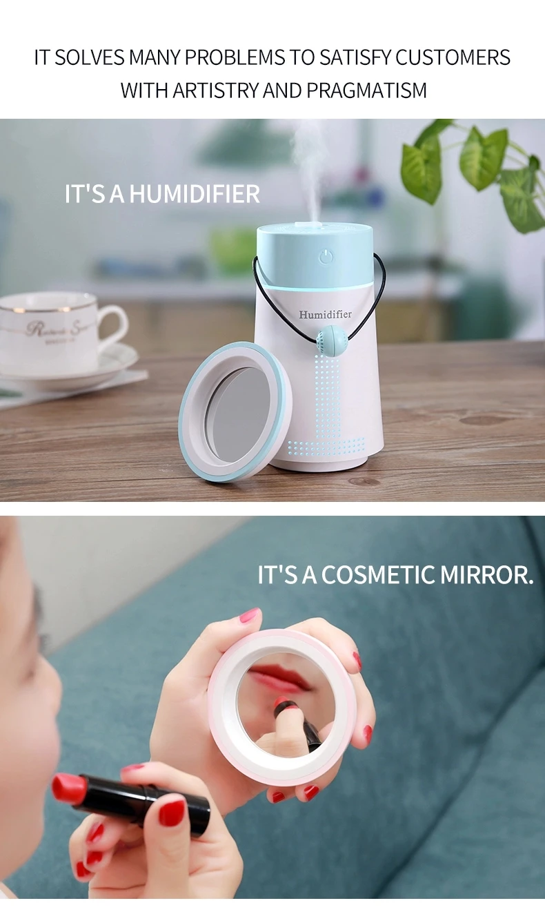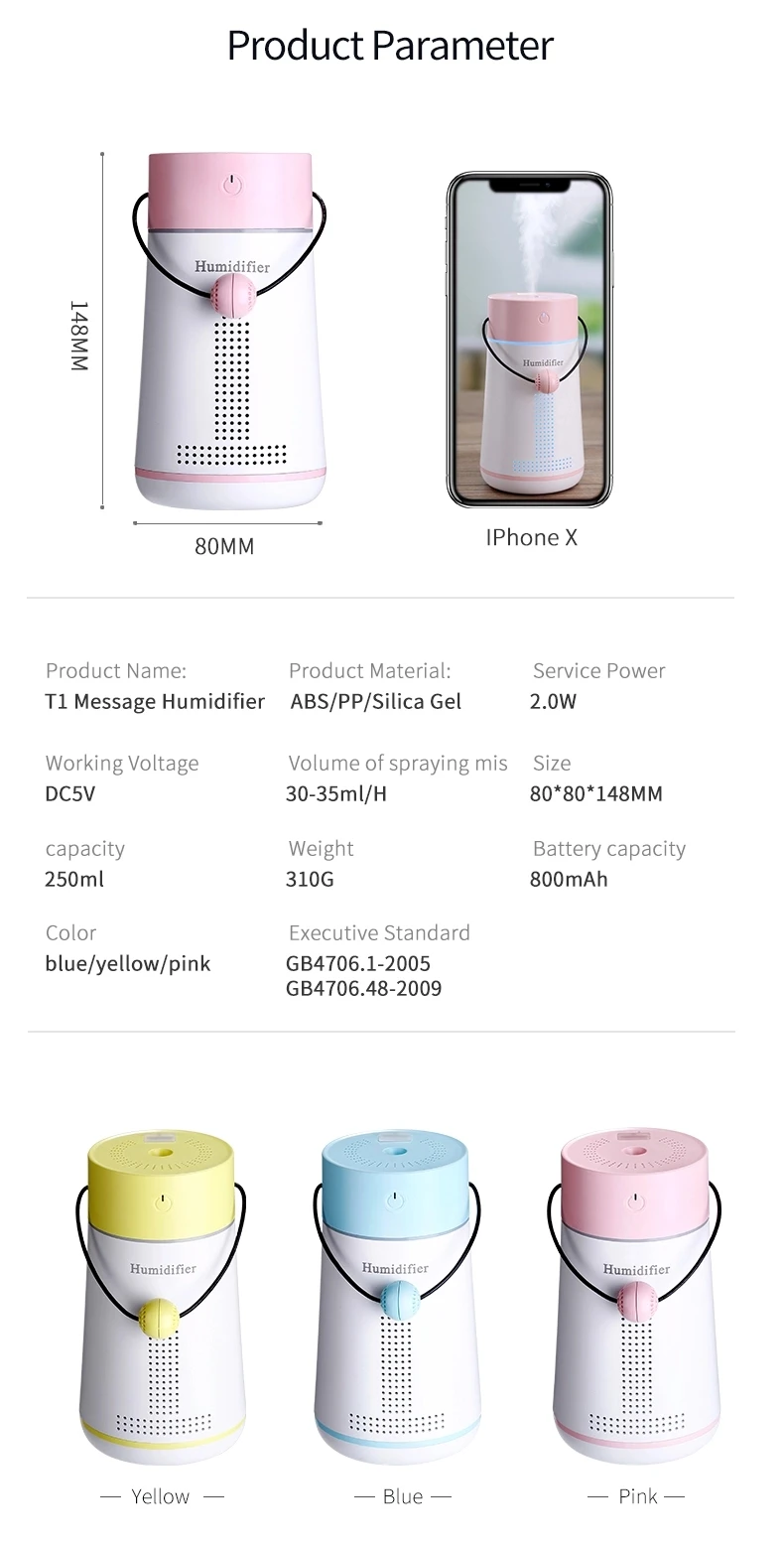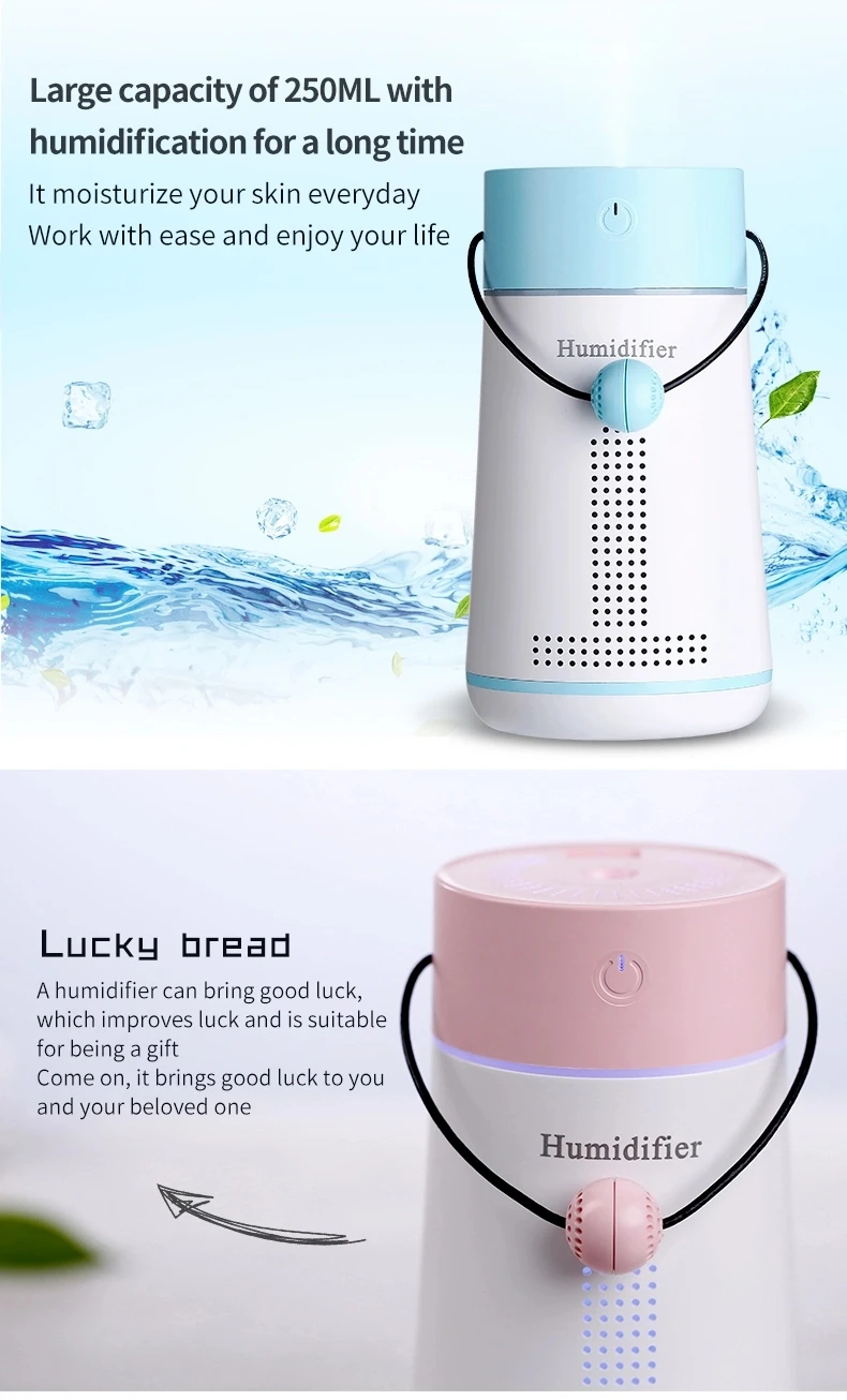 Information: product: USB humidifier Material: ABS Water tank: 250ML Size: 80*80*148(mm) Color: pink,blue Power: 2W Voltage: DC 5V