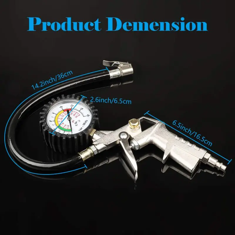 1. Для надувания шины требуется воздушный насос/компрессор. 2. Большой 2,4 "Циферблат защищена нашей Прочная резиновая крышка. 3. Прочная Конструкция зажима позволяет использовать без рук. 4. Легко подключается к текущей инфляционной настройке 1/4 "NPT. 5. Встроенный воздушный клапан Быстро снижает давление на завышенные шины и сбрасывает показания до нуля. 6. Приборная панель защищена нашей прочной резиновой крышкой. 7. Полностью оснащен усиленным резиновым воздушным шлангом 14,2 "для легкого доступа к клапану шины.