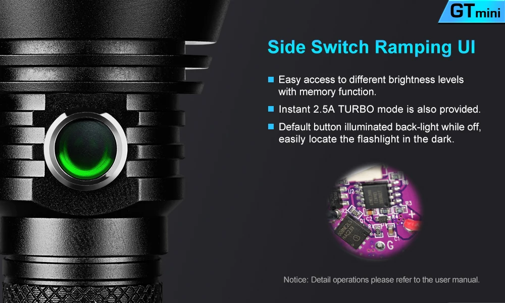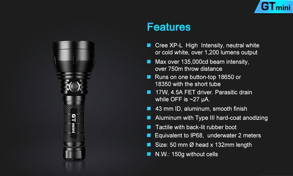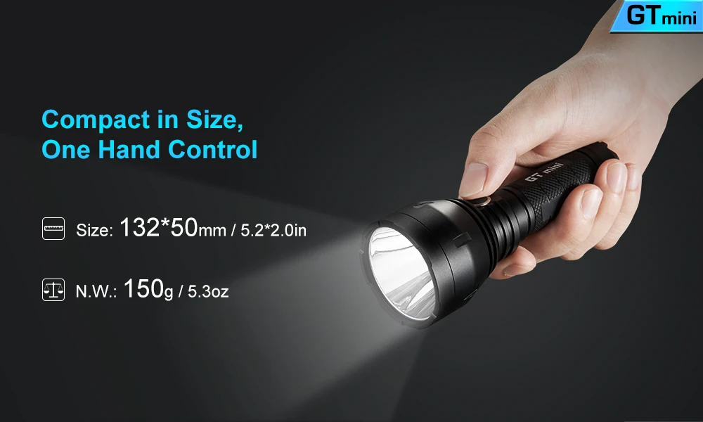 Название продукта: Светодиодный фонарик Lumintop GTmini XPL HI 1200LM с плавным затемнением Торговая марка: Люминесцентный Модель: Gtmini Драйвер фонарика: 17 Вт, 4.5A, драйвер FET Излучатель Тип: XPL HI Луч intensitys: 135000 компакт-диска Светильник Цвет: Холодный белый, натуральный белый Макс Выход: 1200 люмен Диапазоны: 750 метров Режим: Плавное затемнение с функцией памяти Световой поток: 0-1200LM Батарея конфигурации: 1xТоп на пуговицахАккумулятор 18650 (не входит в комплект) Переключатель Тип: Clicky Расположение переключателя: Боковая часть фонарика Материал: Аэрокосмический алюминиевый сплав Устойчивый к высоким температурам: 2 м Водонепроницаемый: IP68, подводный 2 м Объектив: Закаленное ультра-прозрачная стеклянная линза с антибликовым покрытием Ремень для переноски: Шнурки Цвет: Черный Вес: 150 г без аккумулятора Размеры: 132 мм x 50 мм (Длина x диаметр)