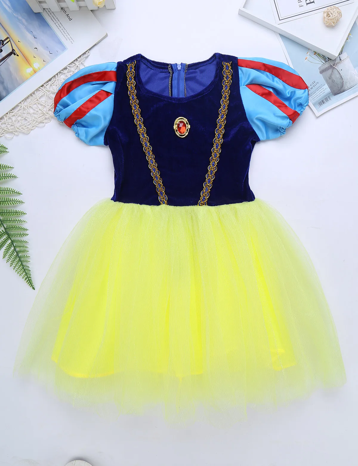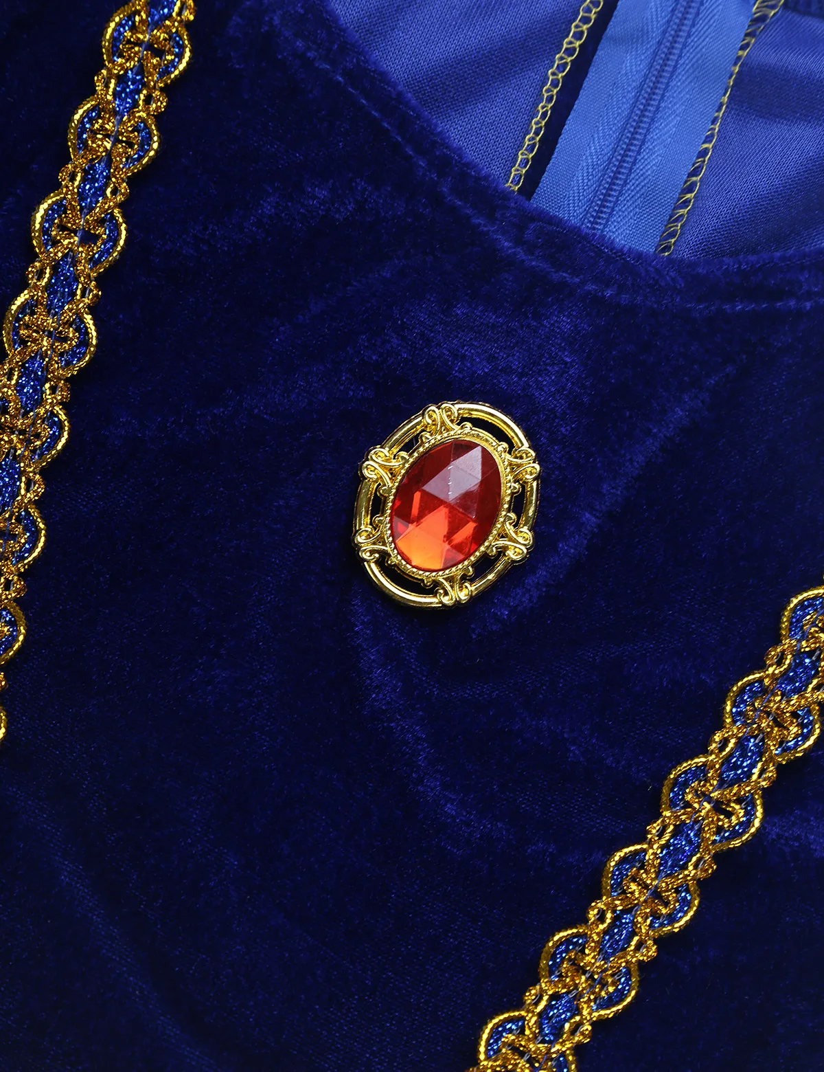 Short puff sleeves, round neck. Velvet top bodice front with a shiny irremovable rhinestone and gold braided trimmings. Sash ties at back. Hidden back zipper closure.